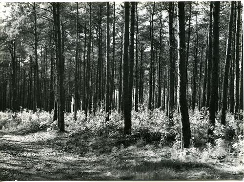 Foto in zwart-wit van een dennebos door J.D. de Jong