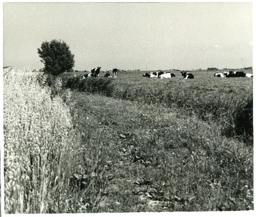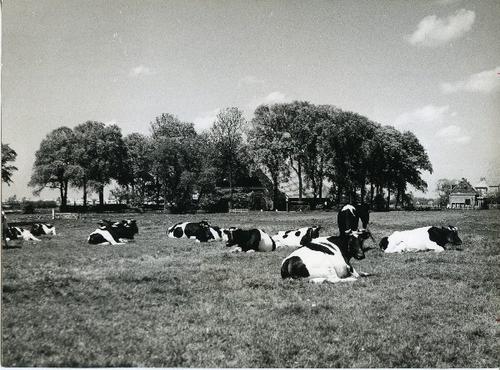 Foto in zwart-wit van liggende koeien in de wei door...
