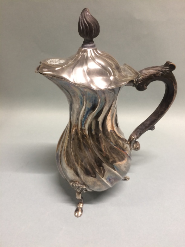 Zilveren kannetje met deksel met gesneden houten han...