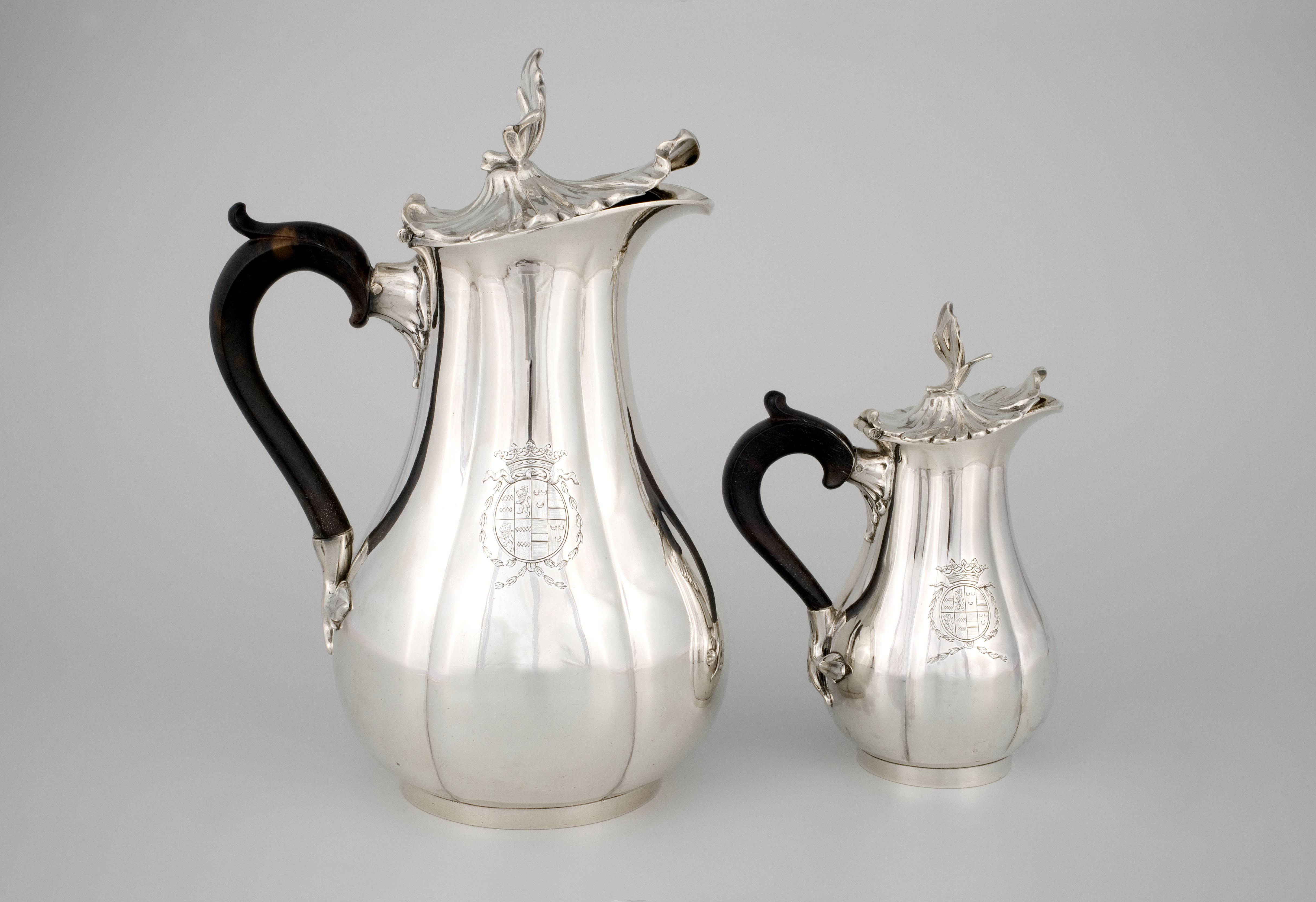 Koffiekan en melkkan met ebbenhouten oor, op de buik...