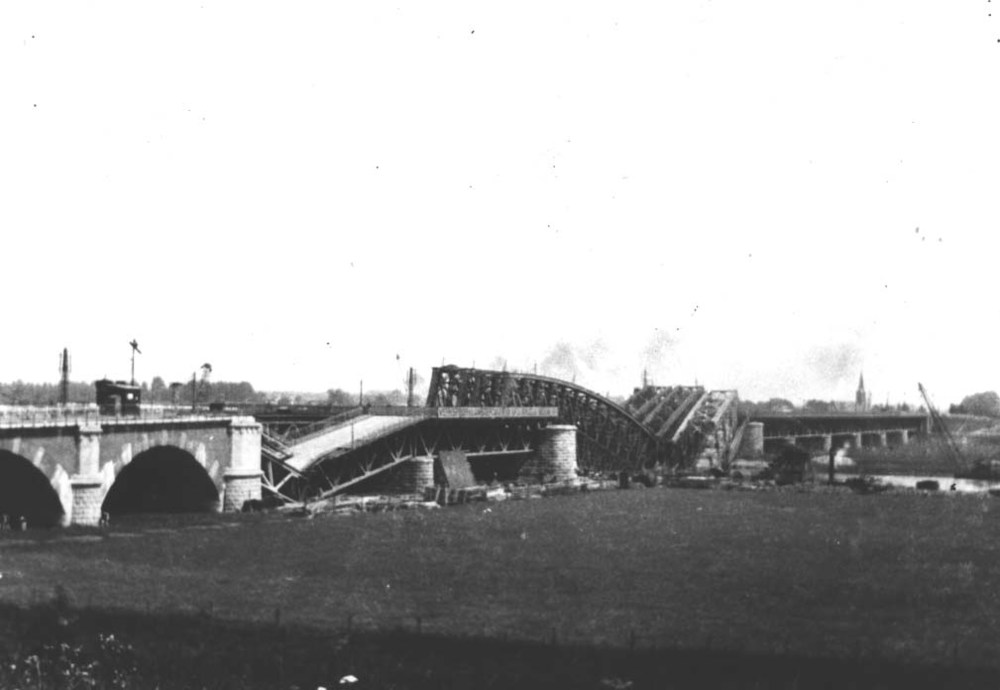 Vernielde verkeers- en spoorbruggen door oorlogshand...