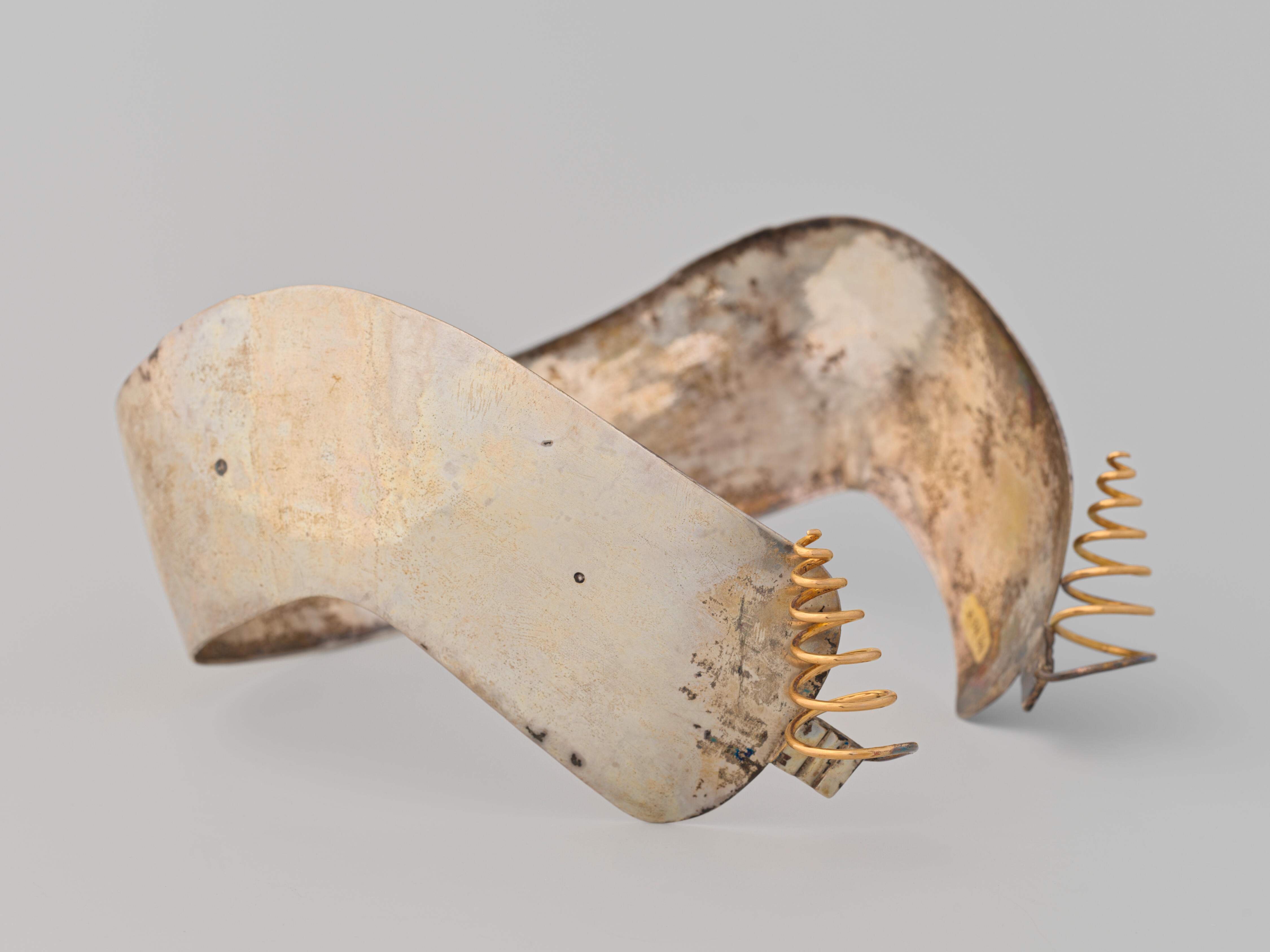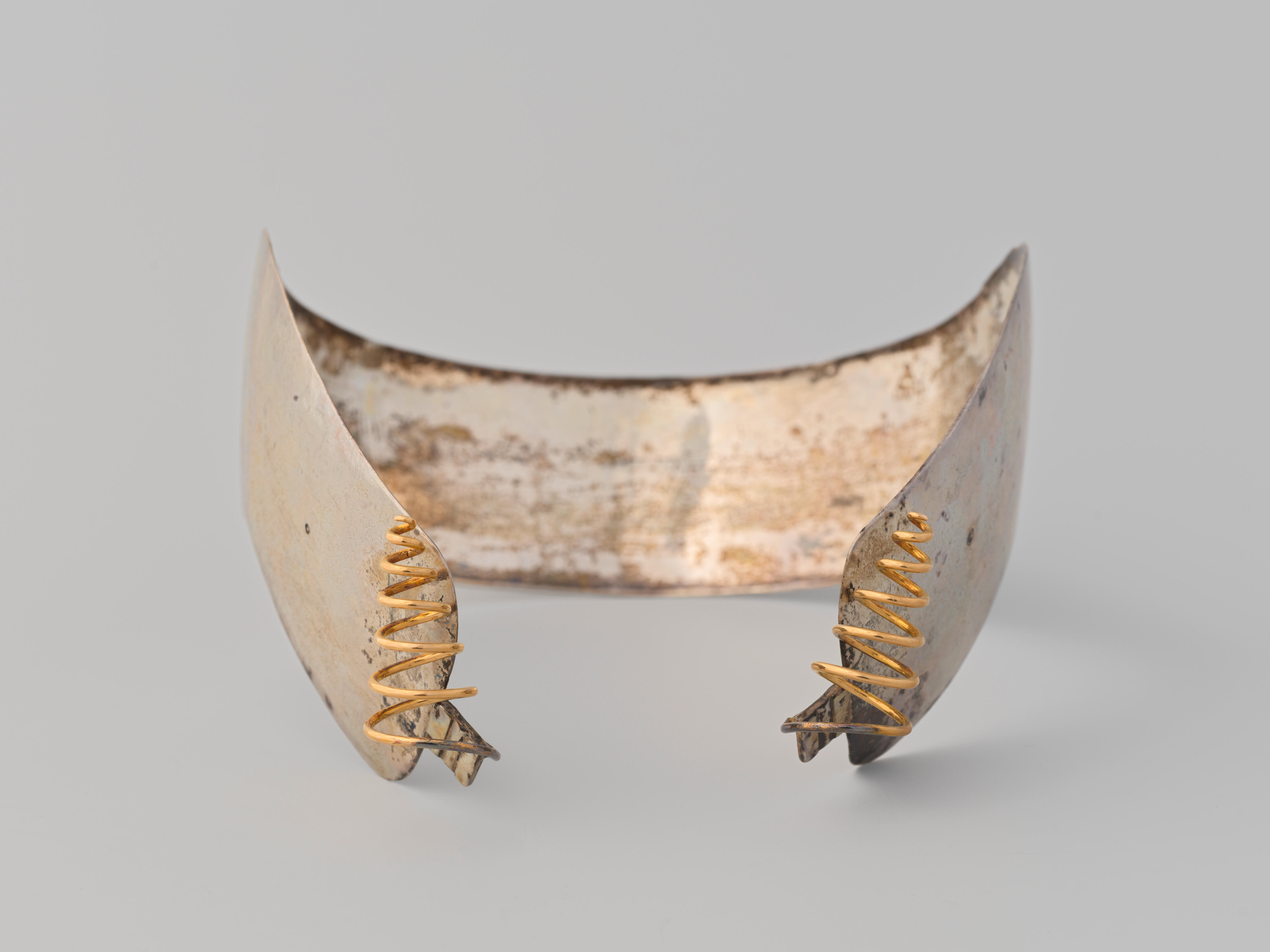 Zilveren oorijzer met gouden windingen, gedragen in ...