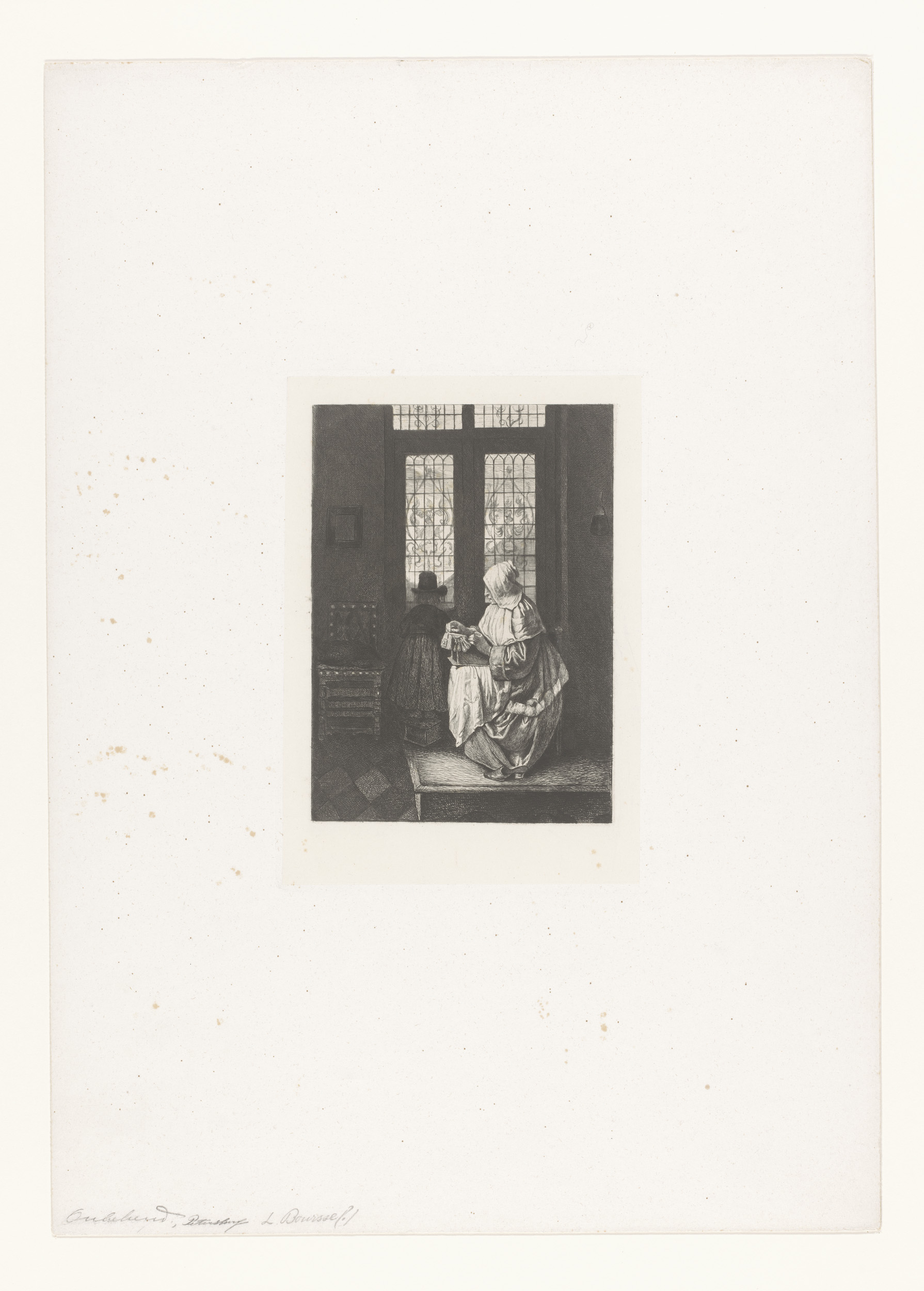Interieur met kantklossende vrouw en man aan het raam