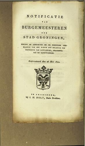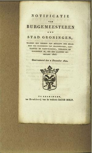 Notificatie brandspuit-, lantaarn-, wachtgeld, 1822