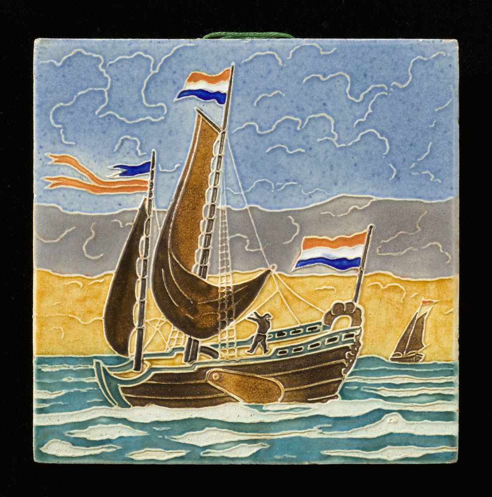 Tegel in cloisonné-techniek, voorstellende speeljach...