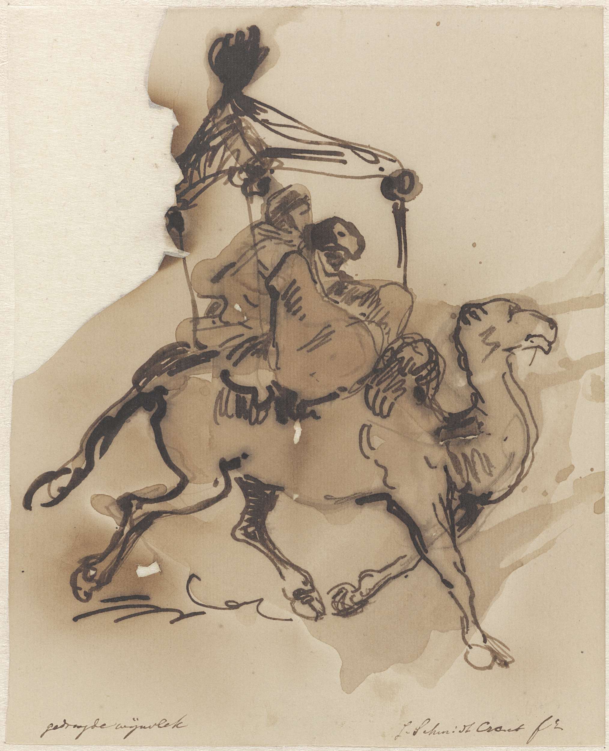Kameel met twee berijders onder een baldakijn