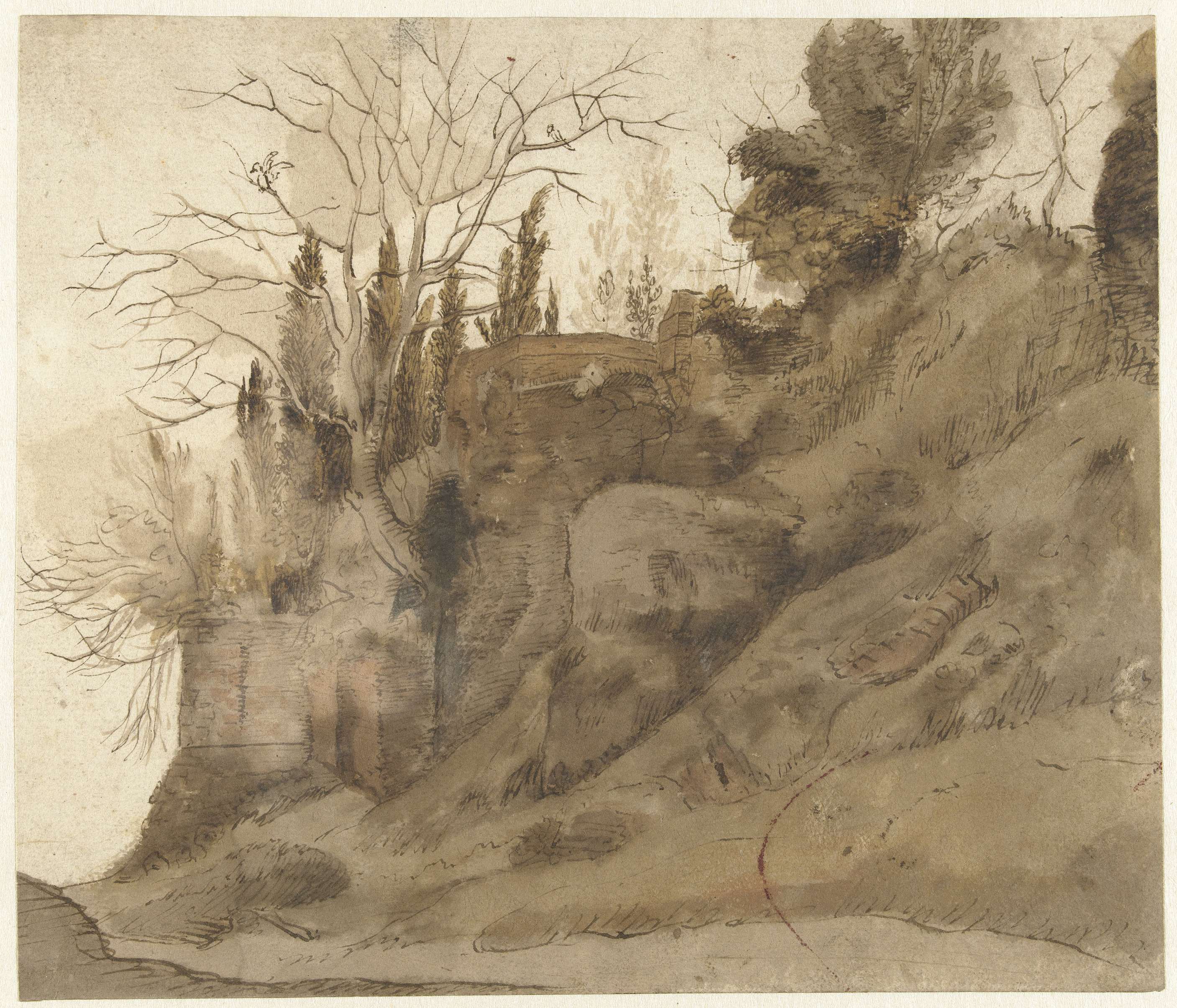 Landschap met tekenaar, geestelijke en andere figuren