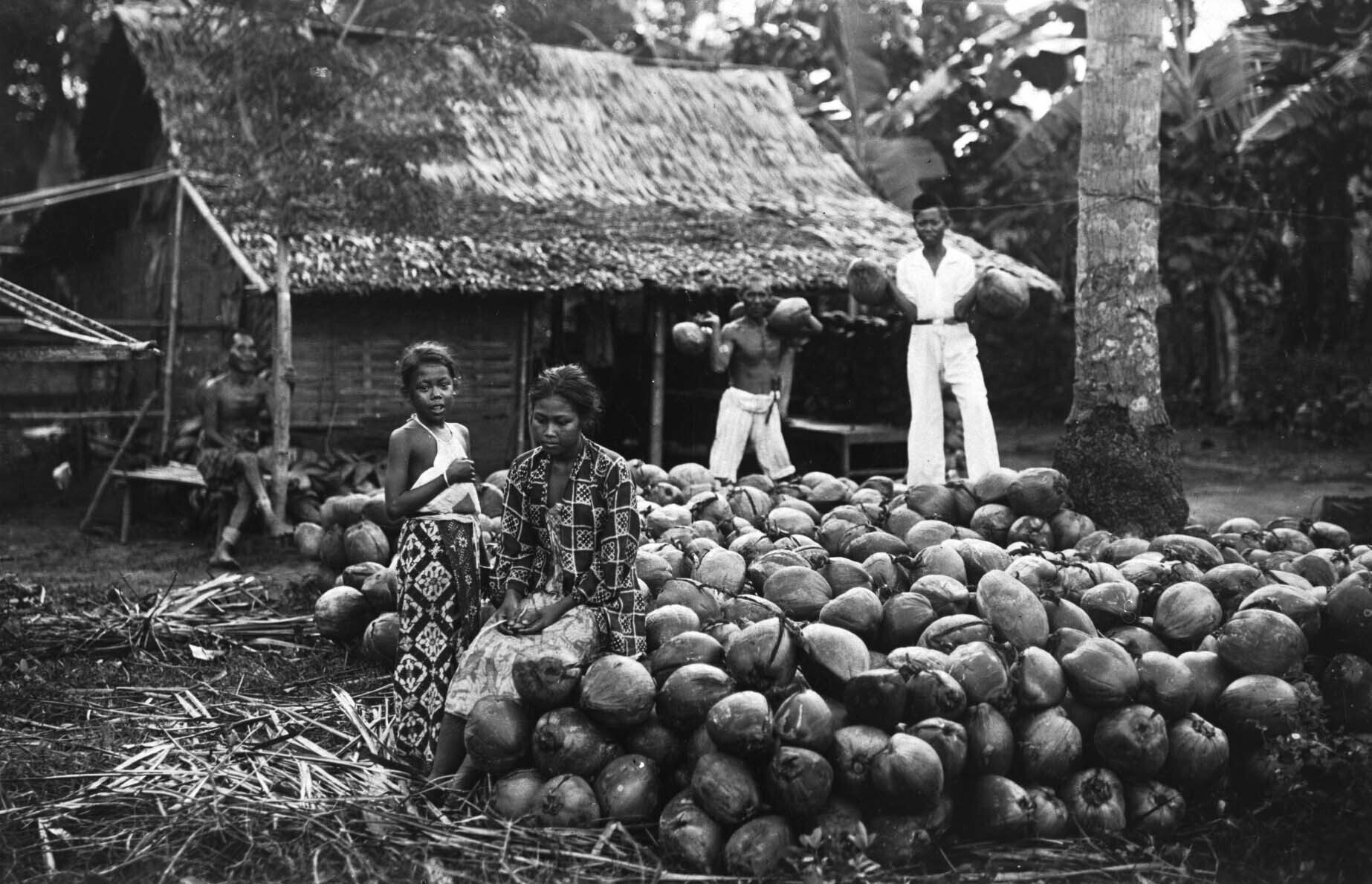 Erf met stapel kokosnoten, daarbij drie mannen, een ...