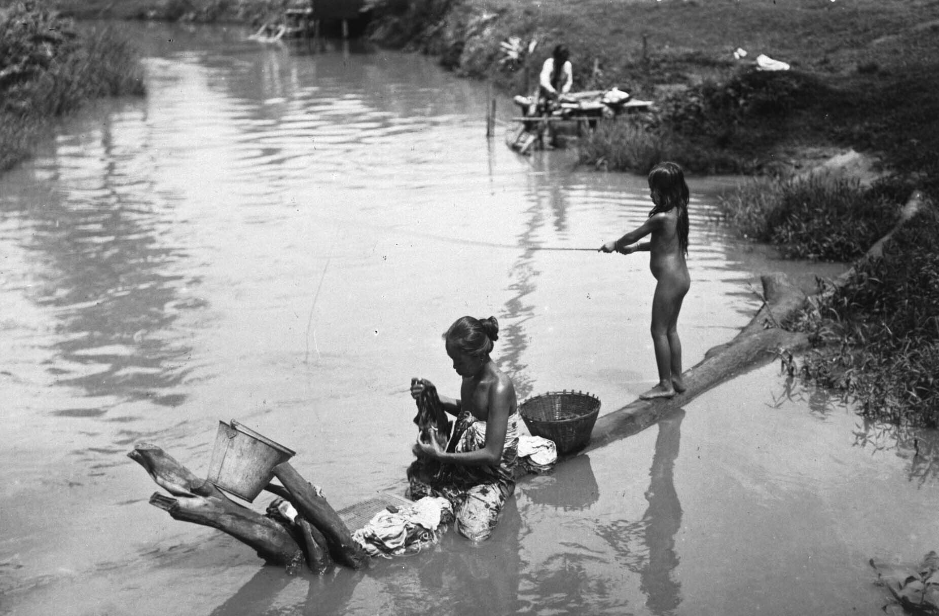 Vrouw doet de was in een rivier