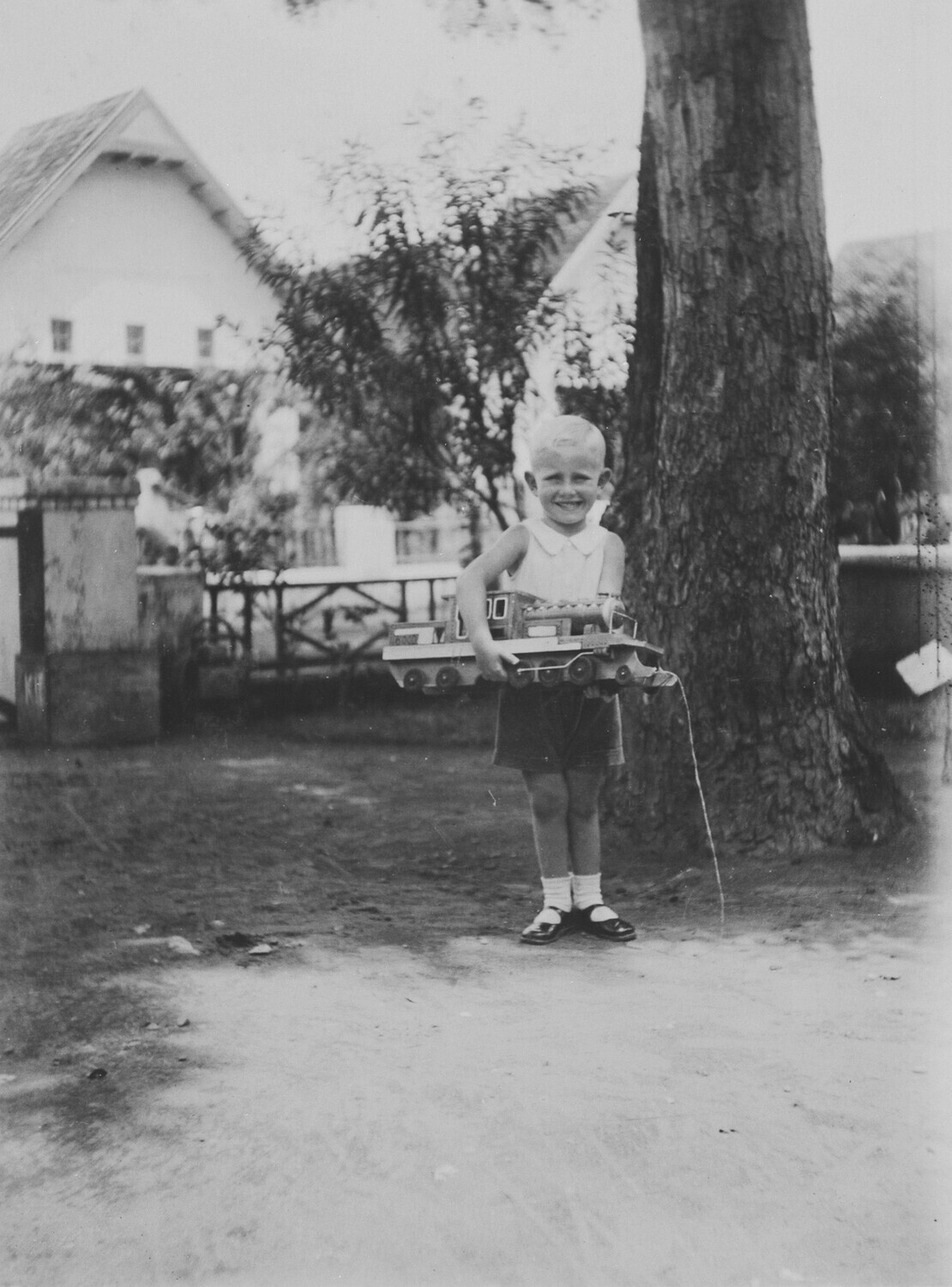 Europese jongen poseert met zijn speelgoedlocomotief...