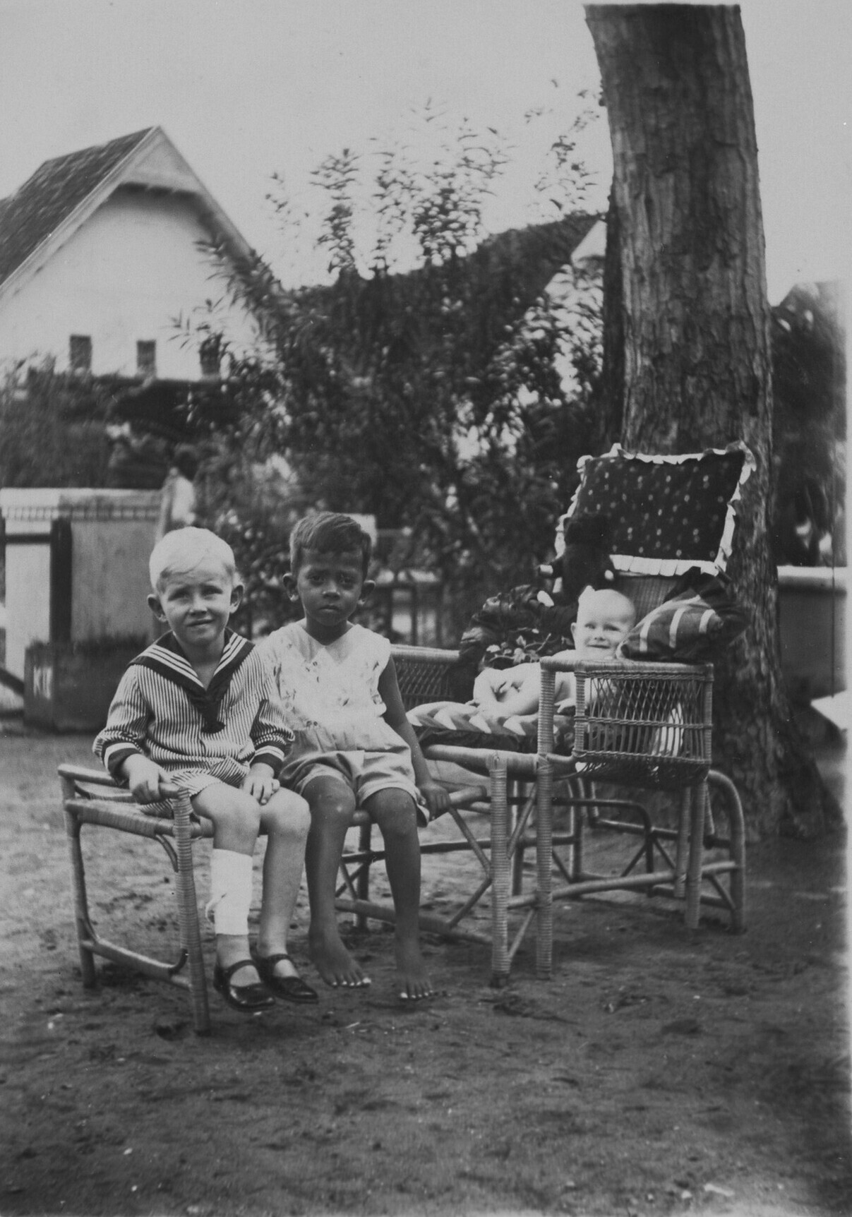 Portret van een groep kinderen op een rotan ligstoel...
