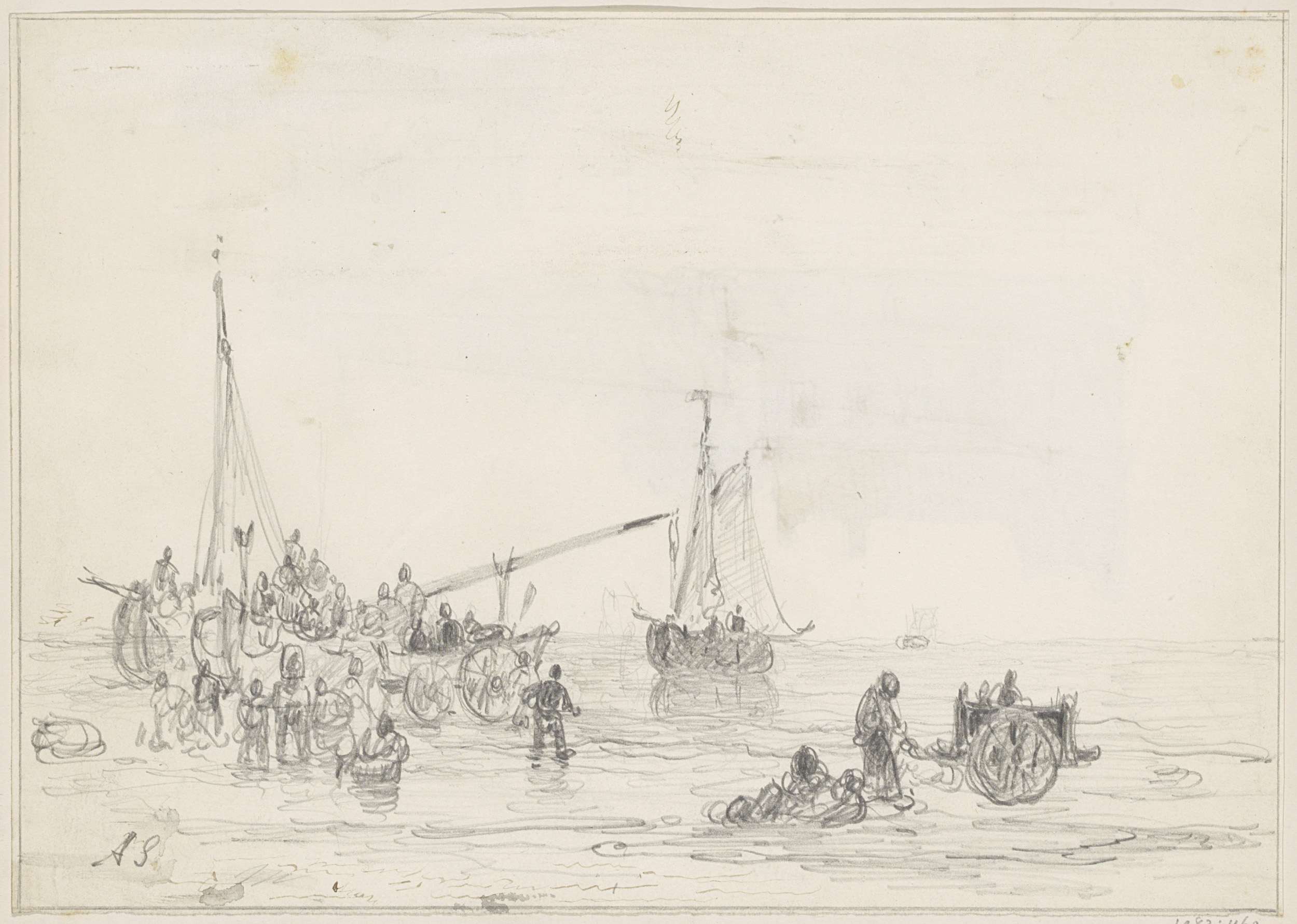 Strandgezicht met figuren bij een schip