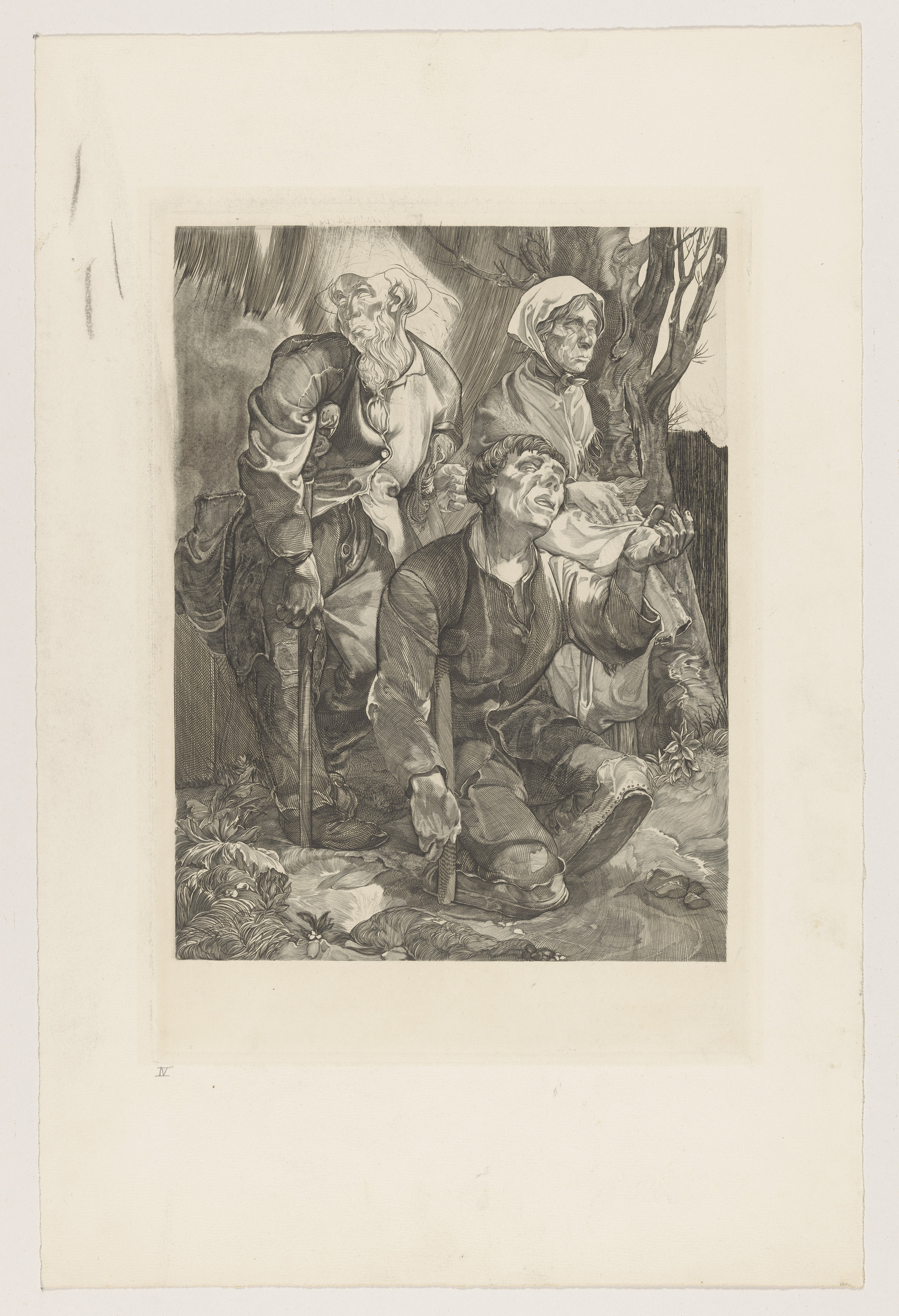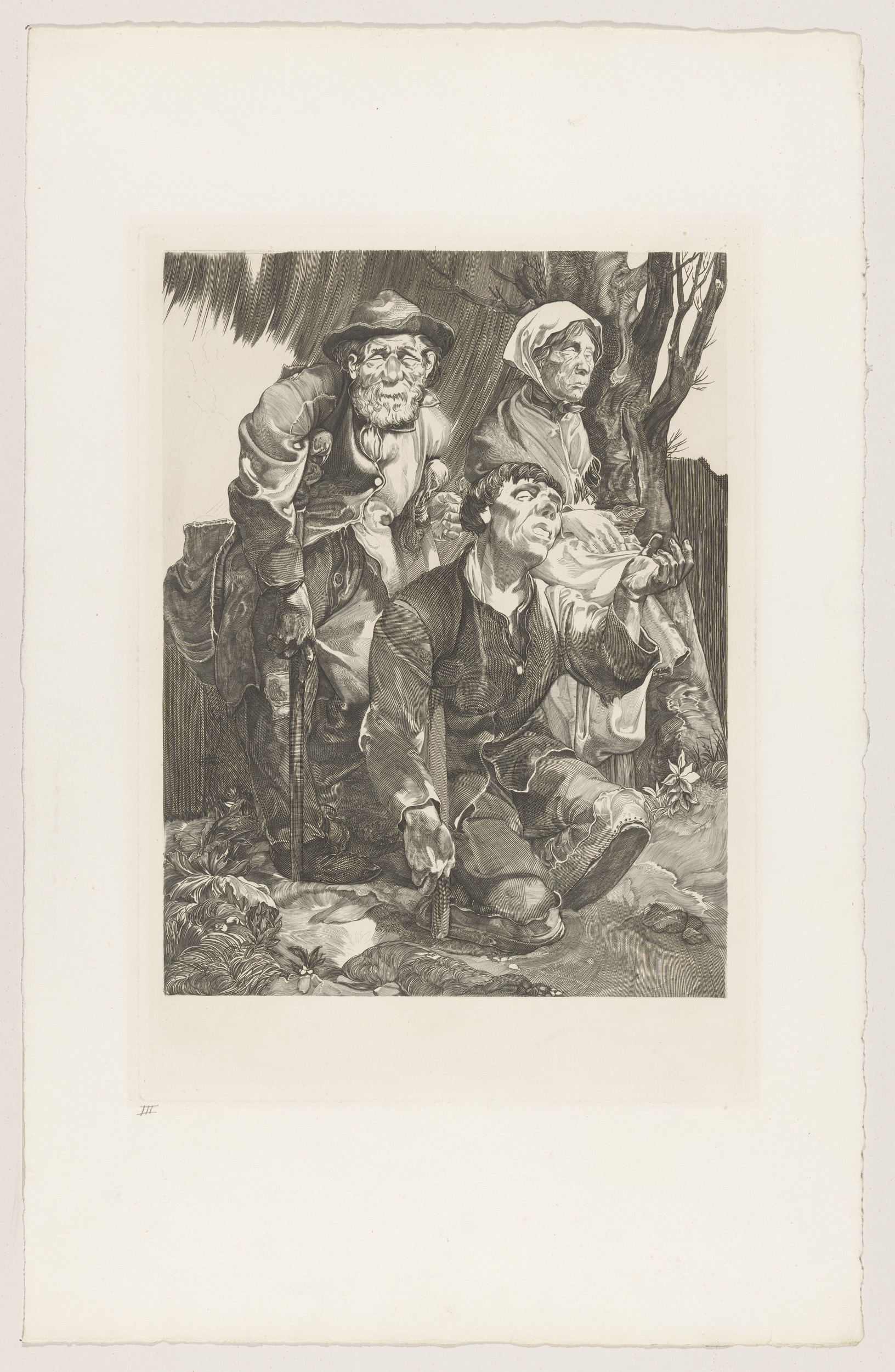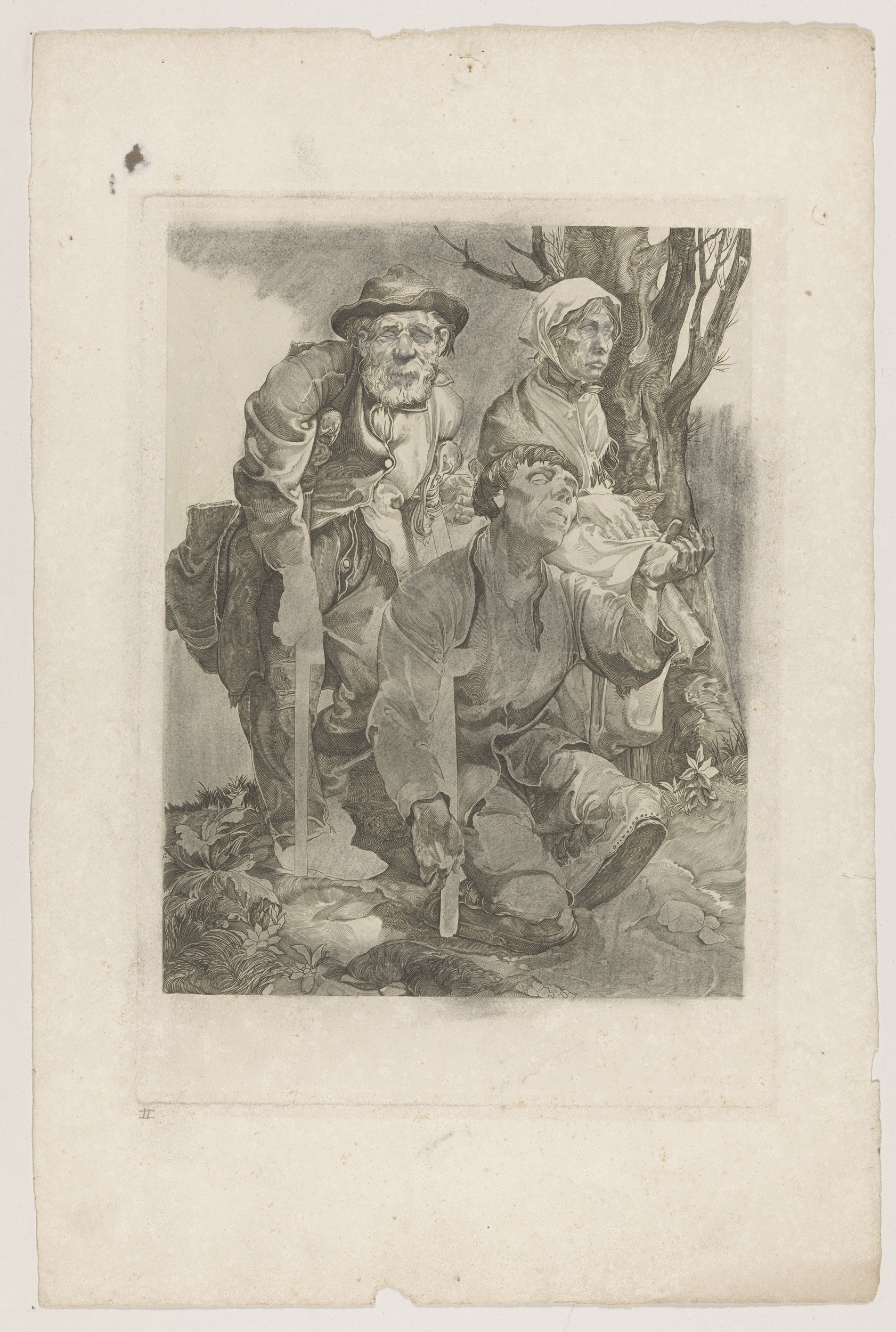 Drie bedelaars bij een boom