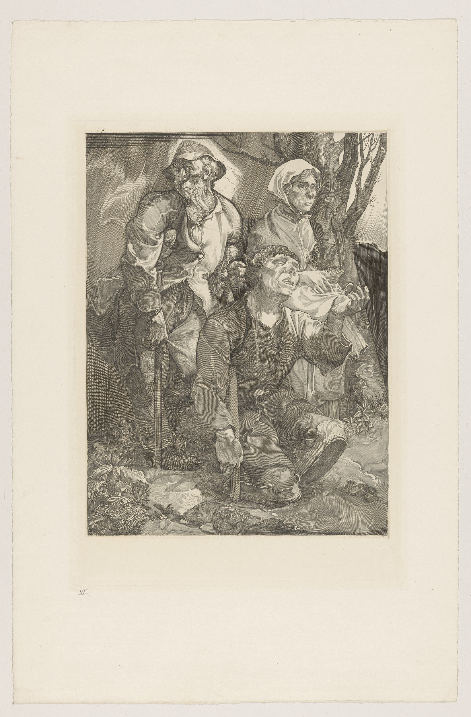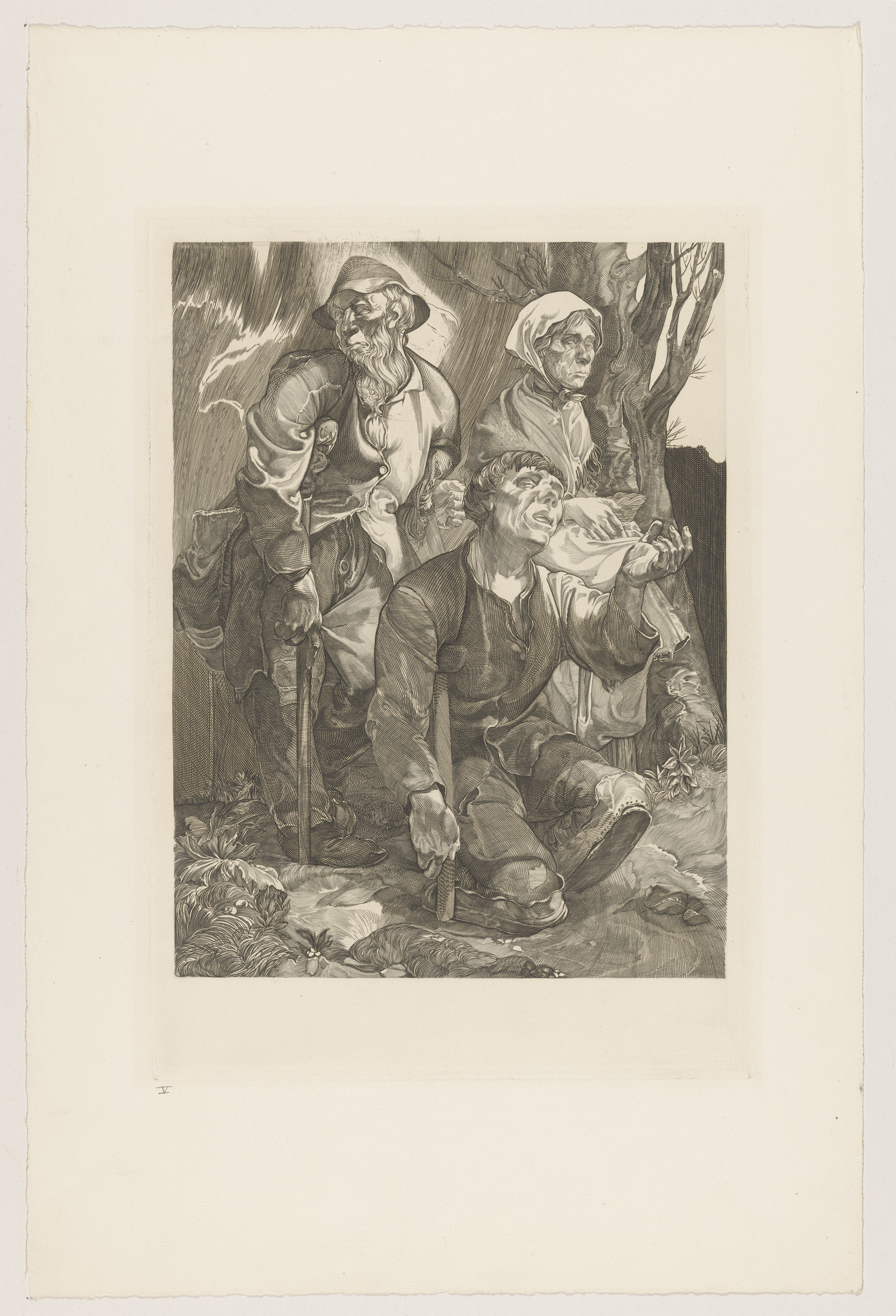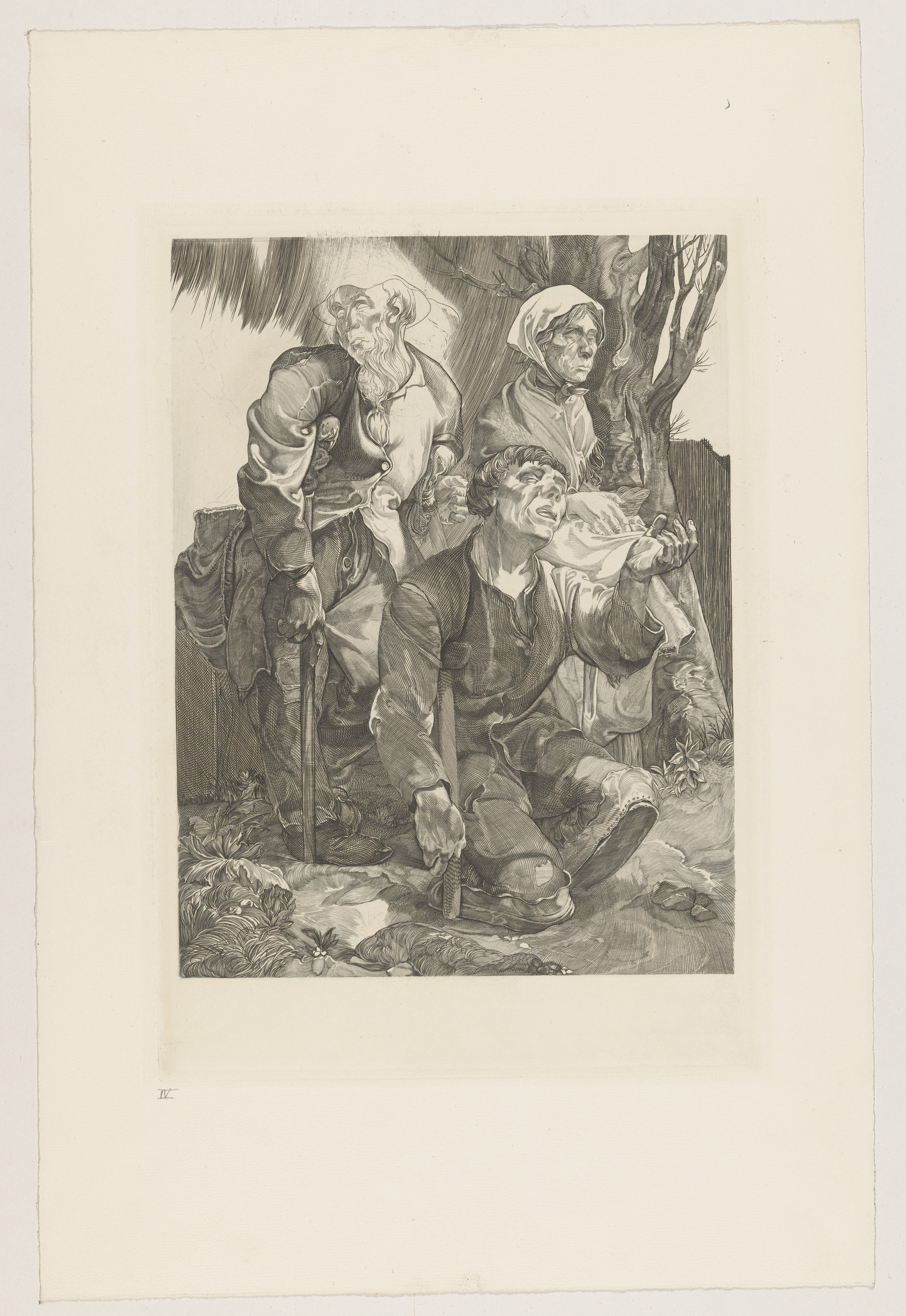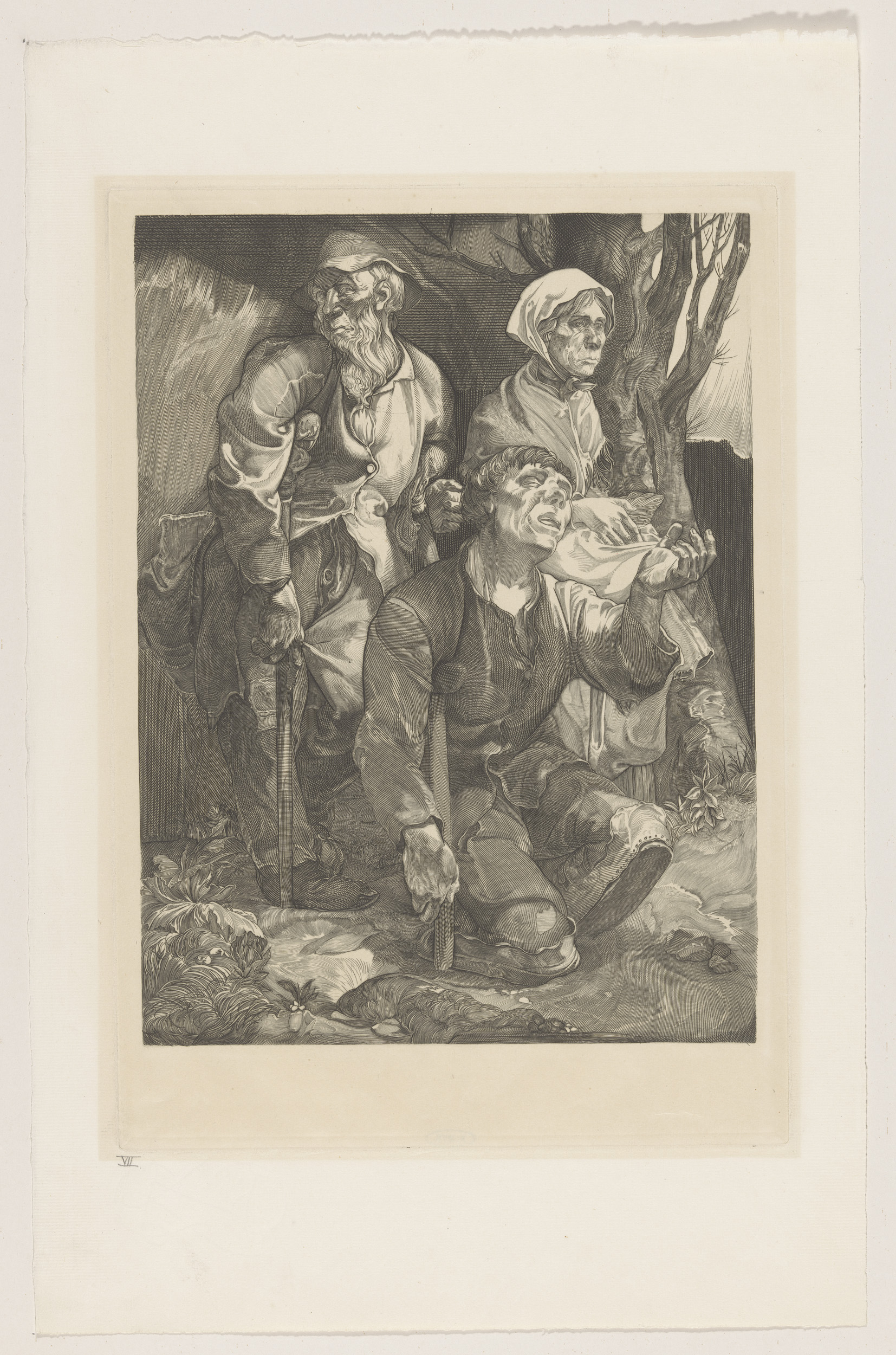 Drie bedelaars bij een boom
