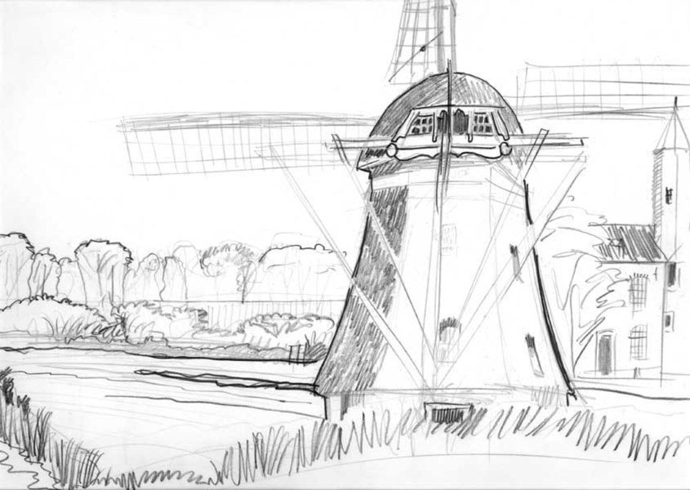Tekening, voorstellende een molen en eendeel van kas...