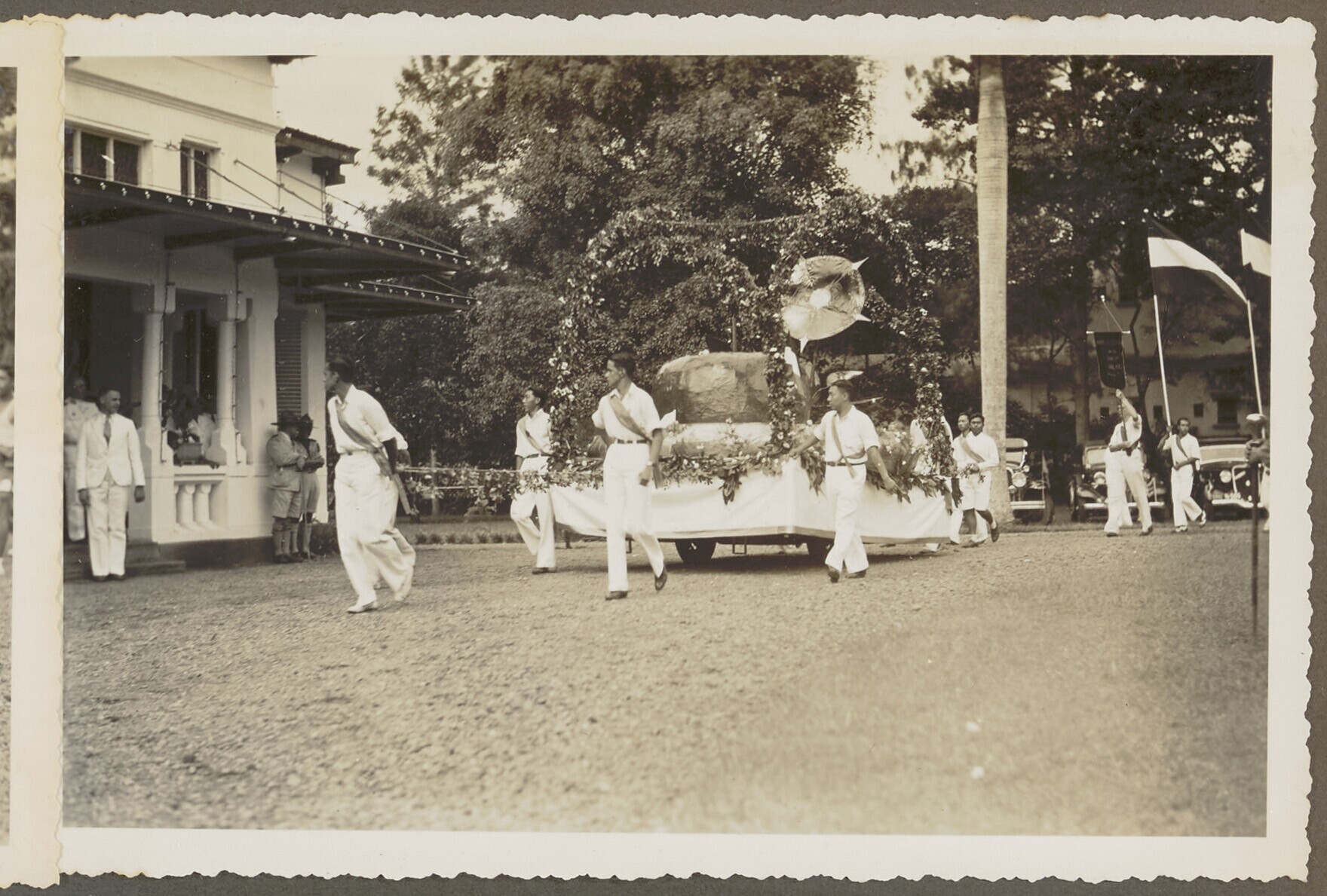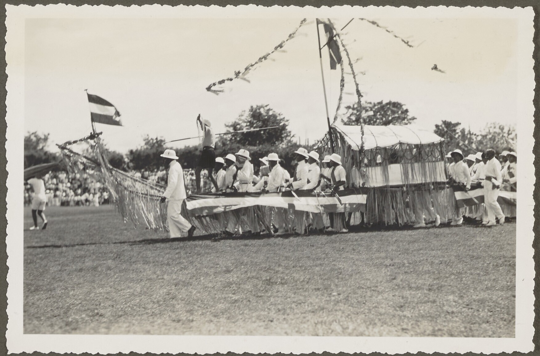 Mannen in tropenkleding met een praalwagen in vorm v...
