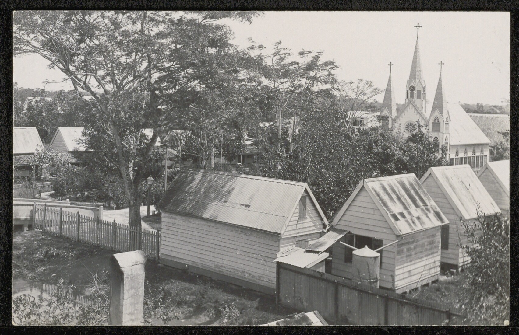 Gezicht over gebouwen en kerk op het terrein van de ...