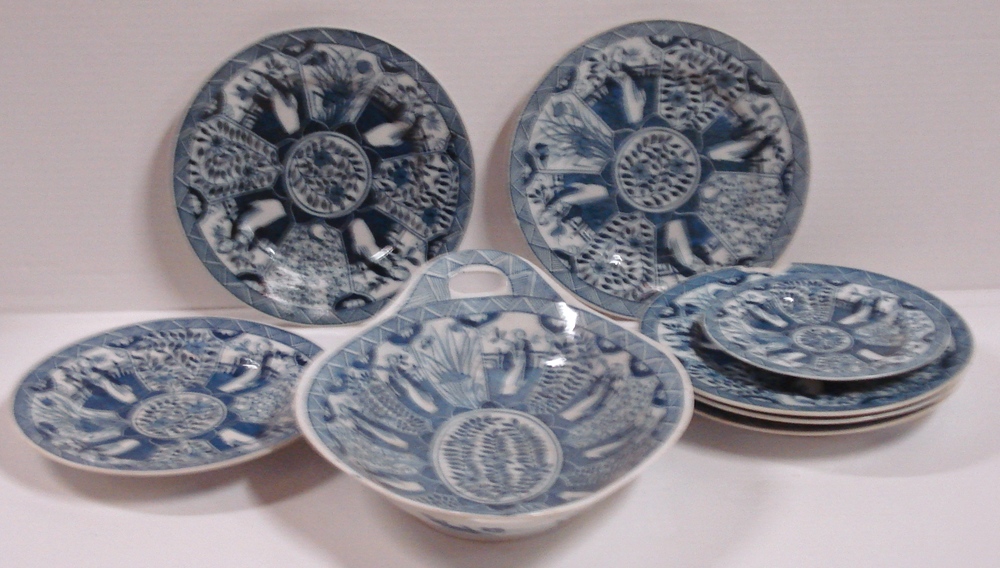 servies. Gedecoreerd in blauw met randmotief en drie...