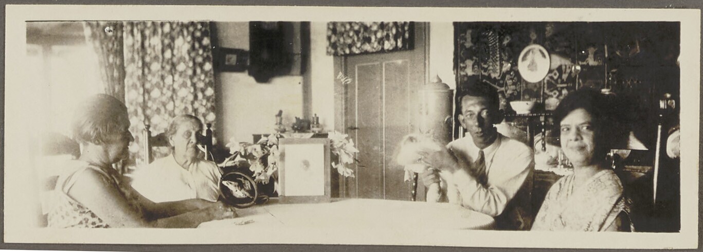 Portret van drie vrouwen en één man zittend aan de t...