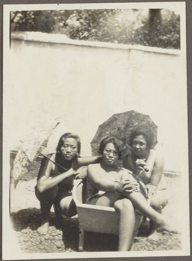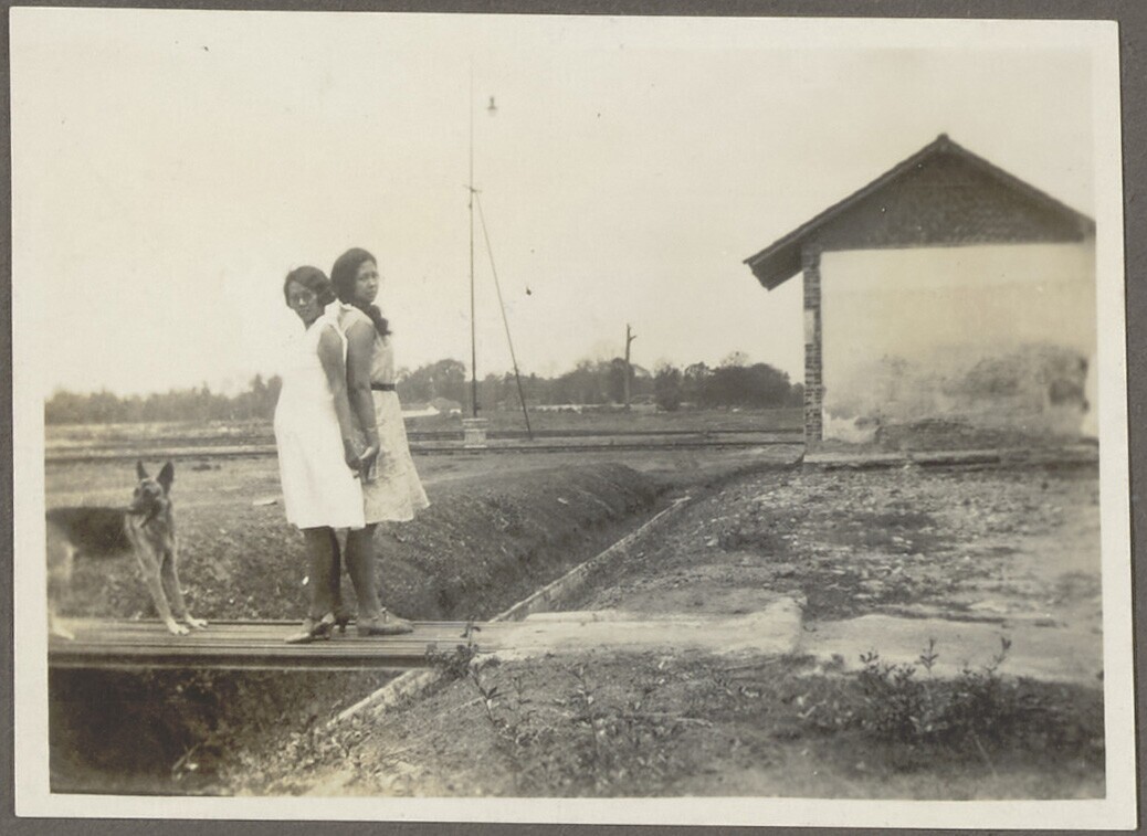 Portret van twee vrouwen voor een bamboetrap
