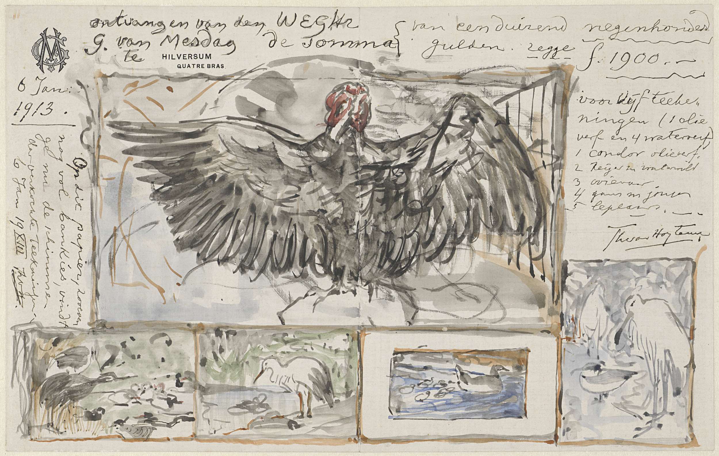 Vijf schetsen naar werken van vogels