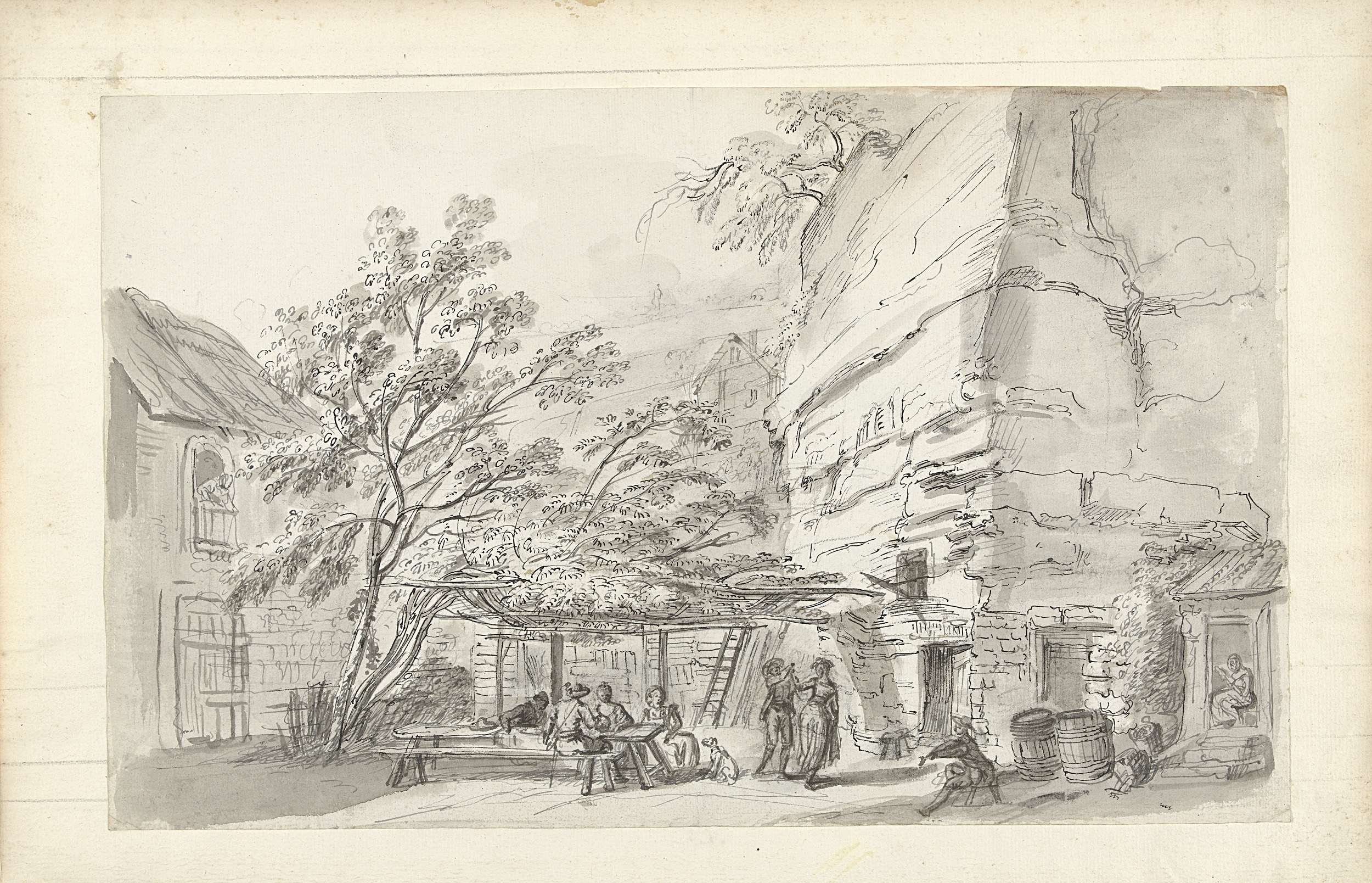 Drinkende en dansende personen op de binnenplaats va...