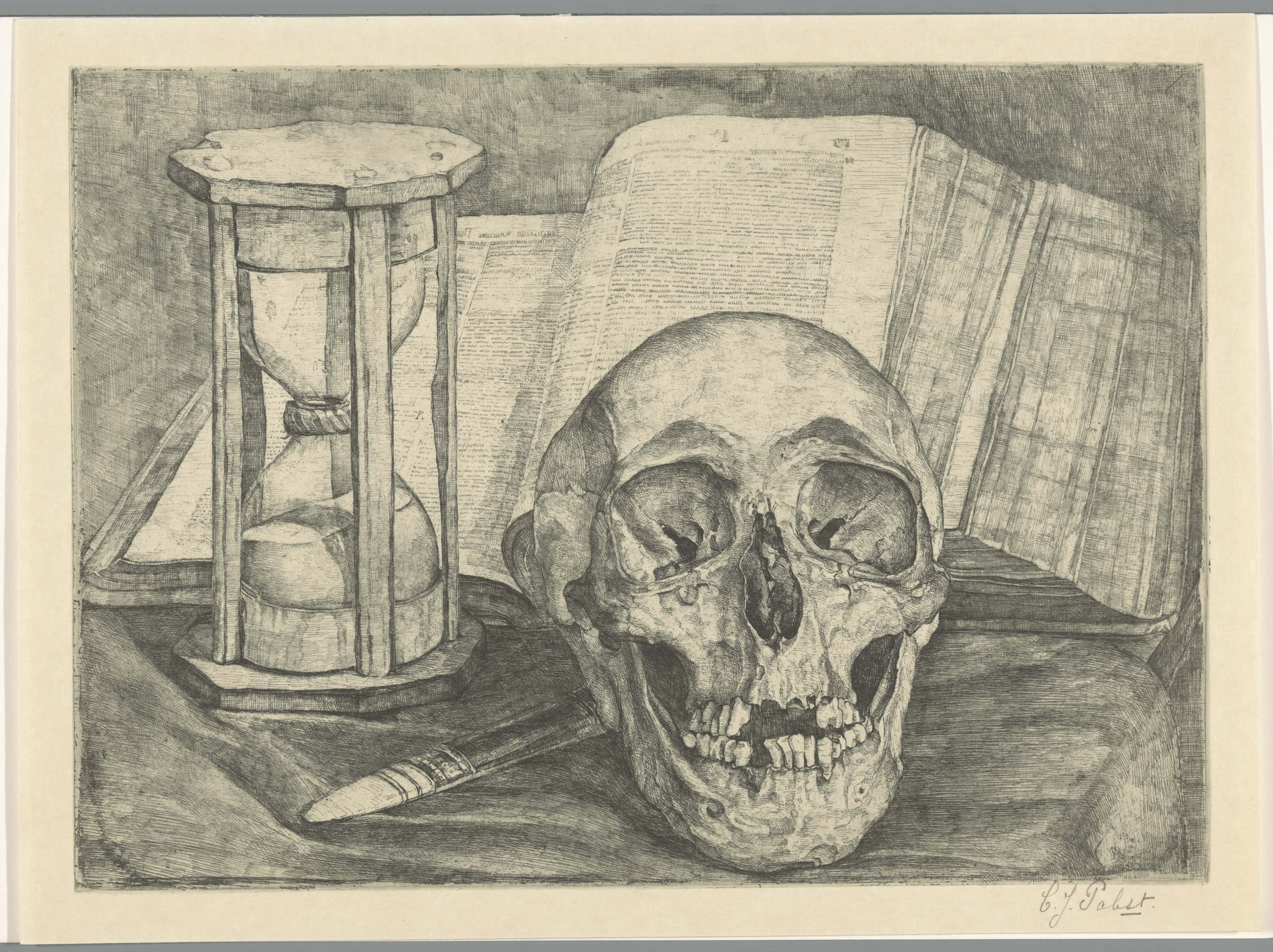 Stilleven met een schedel, een zandloper, een boek e...