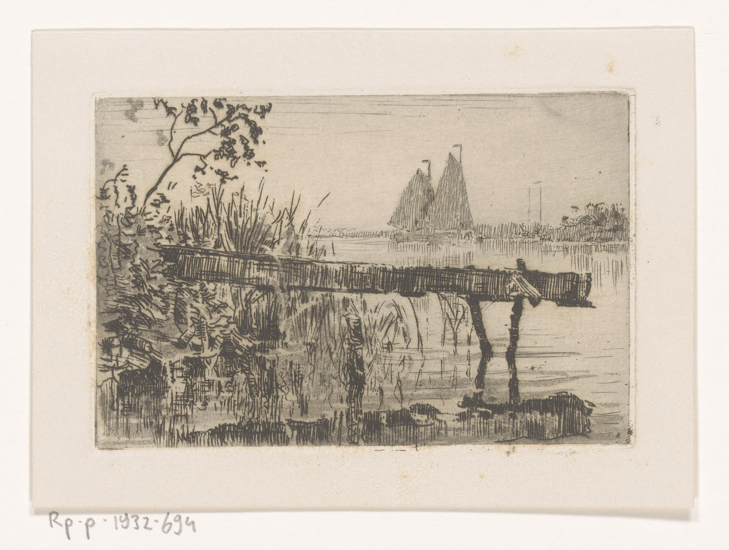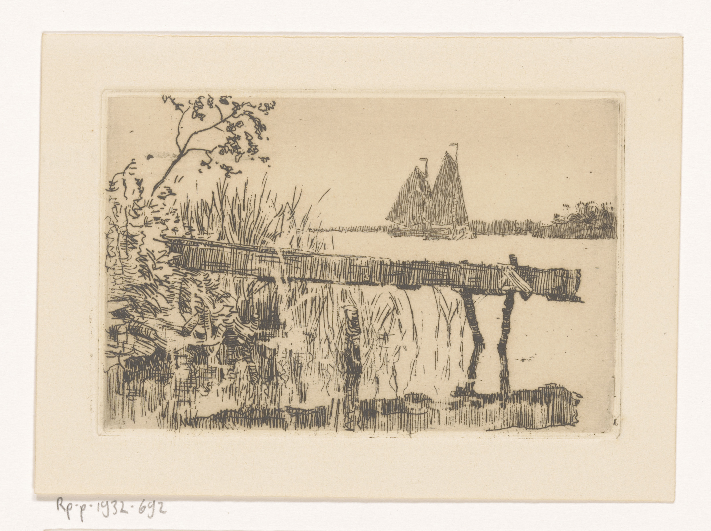 Loopplank aan de oever, daarachter twee zeilboten