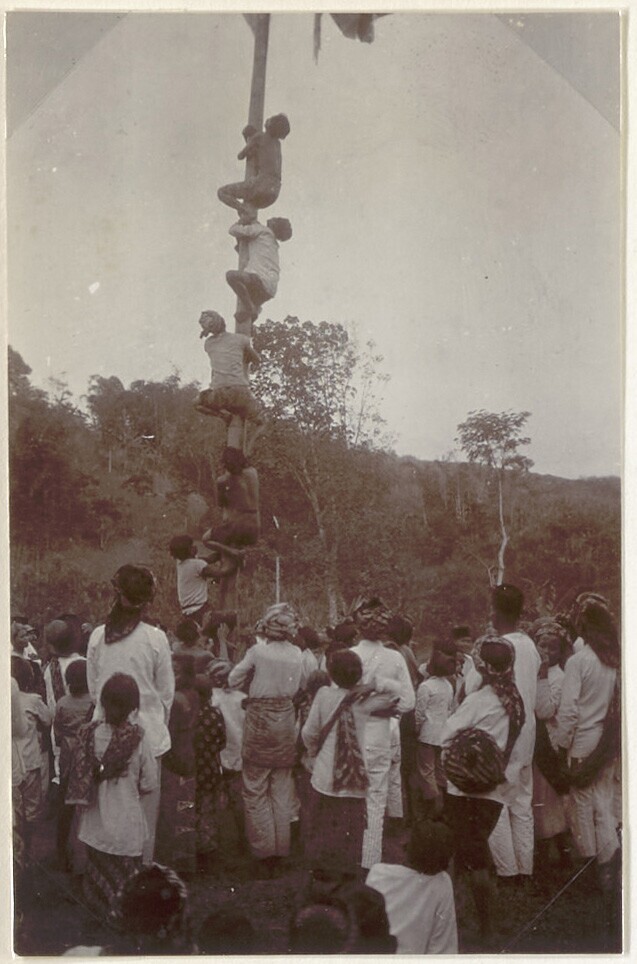 Drie Javaanse jongens die een paal beklimmen met daa...