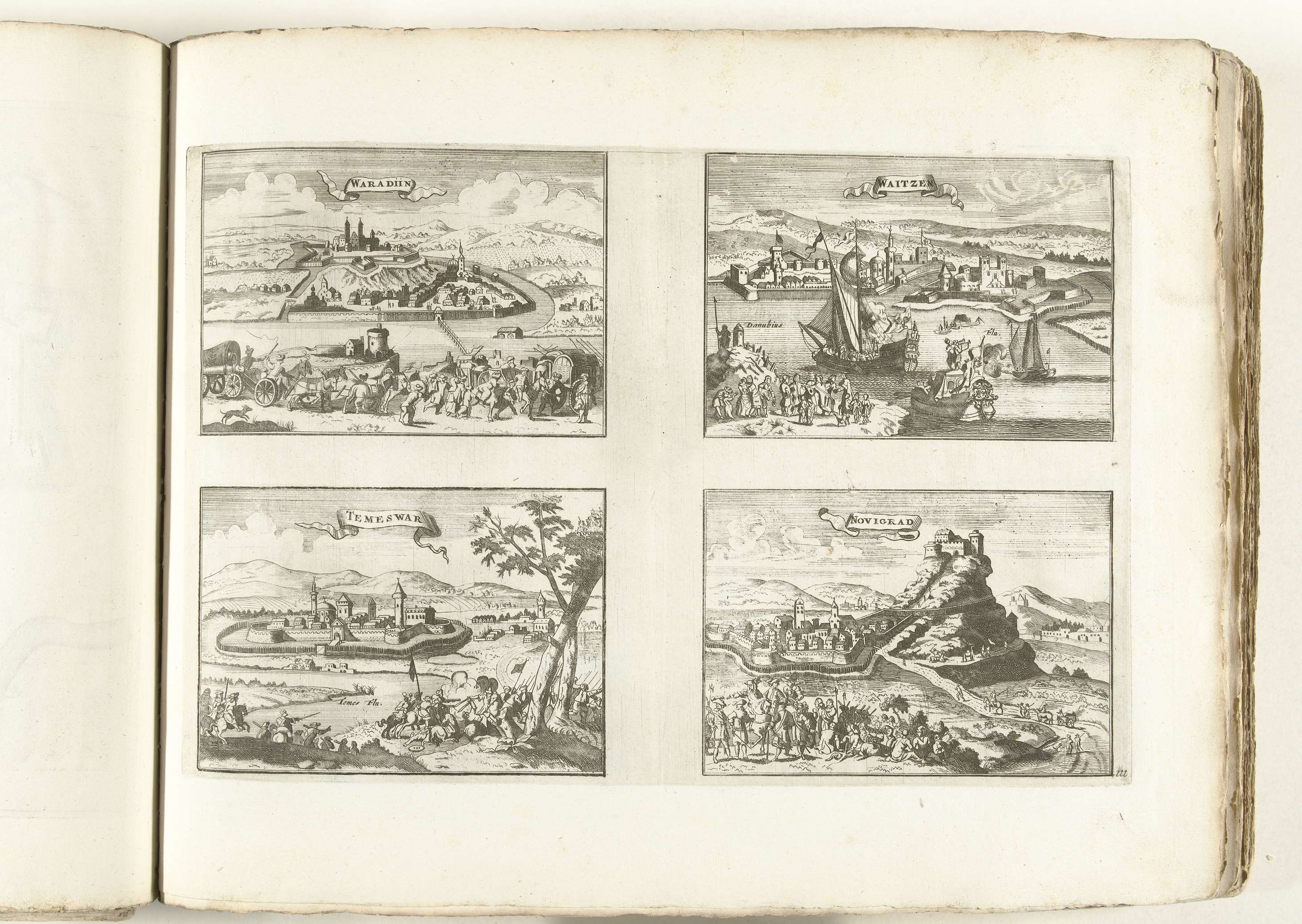 Gezichten op Waradiin, Vác, Temesvár en Novigrad, ca...