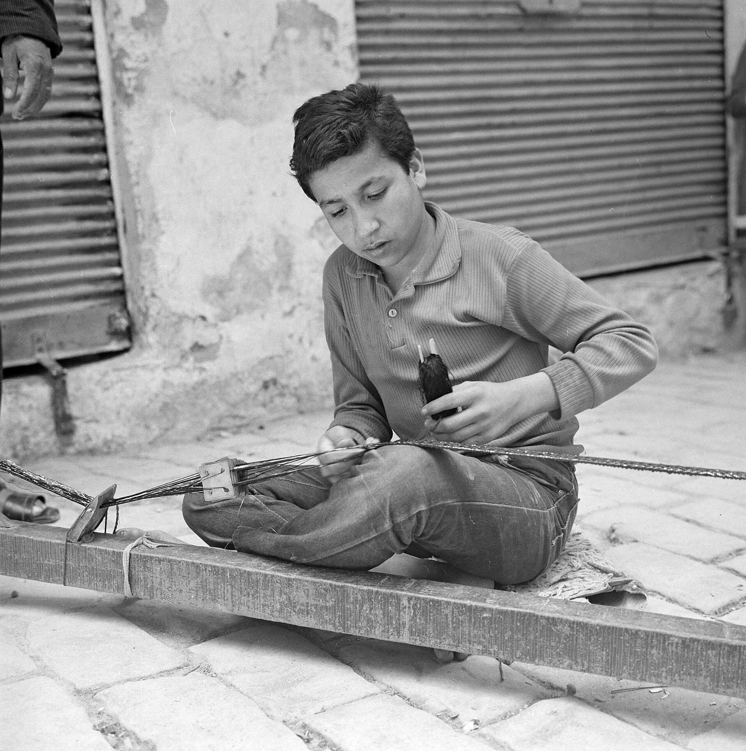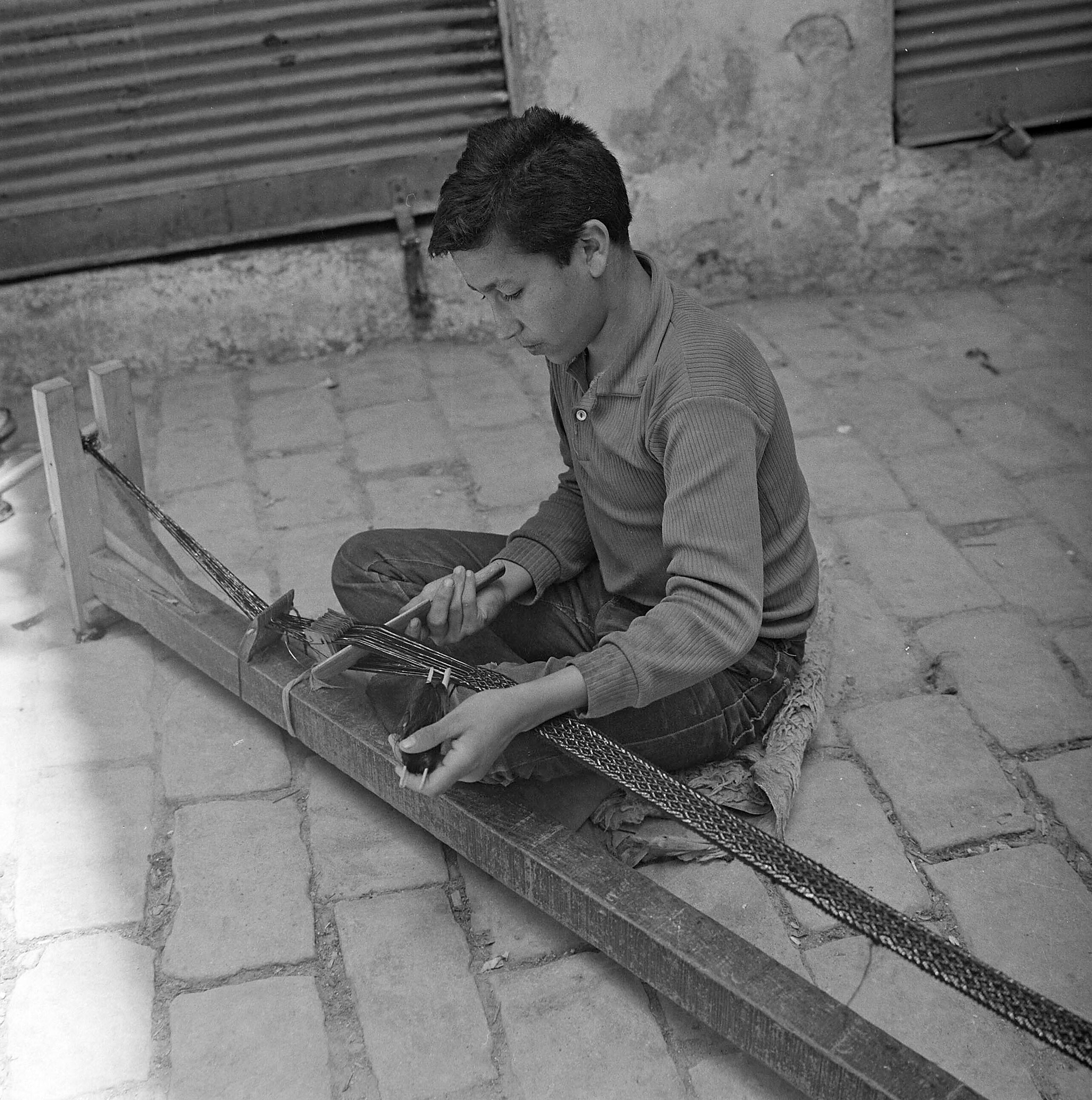 Portret van een jongen werkend op een bandweefgetouw
