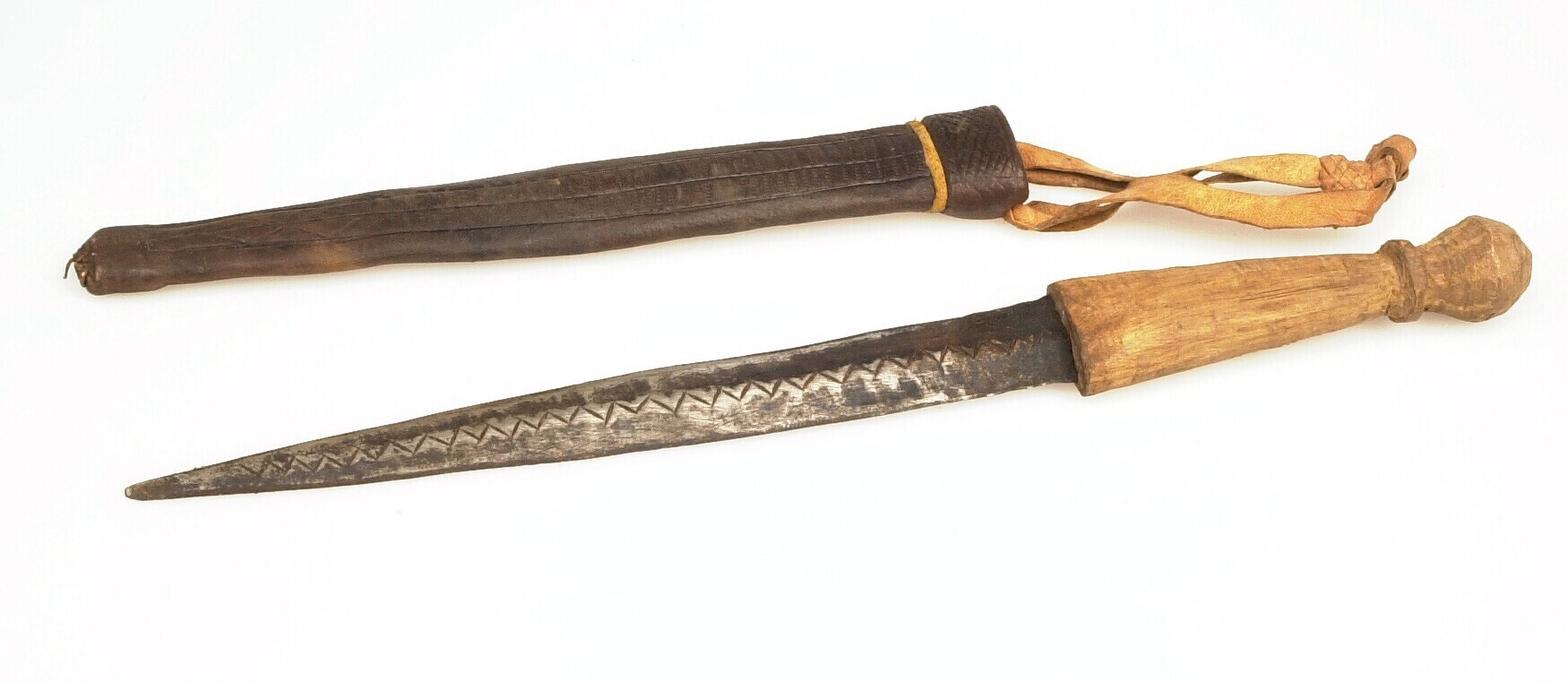 IJzeren jachtmes met houten heft in leren schede