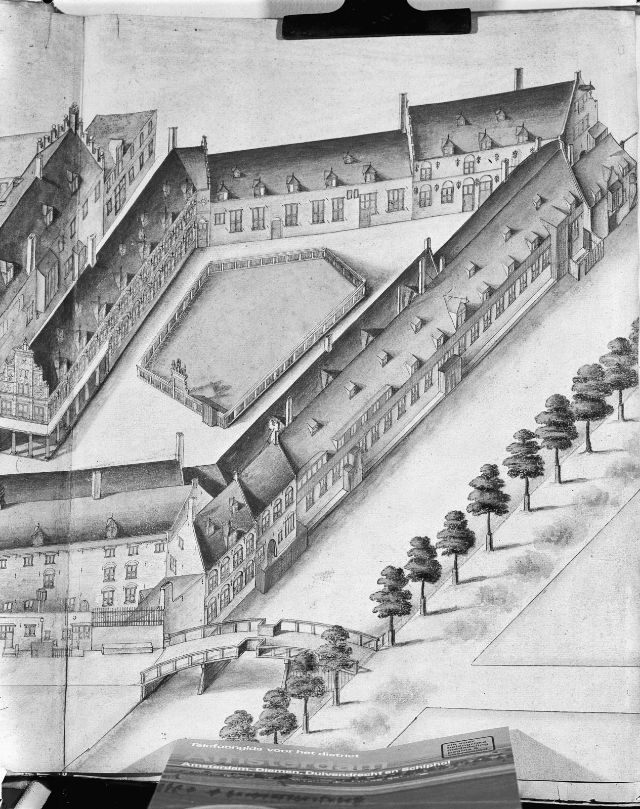 Gedeelte van de vogelvluchttekening van de gebouwen ...