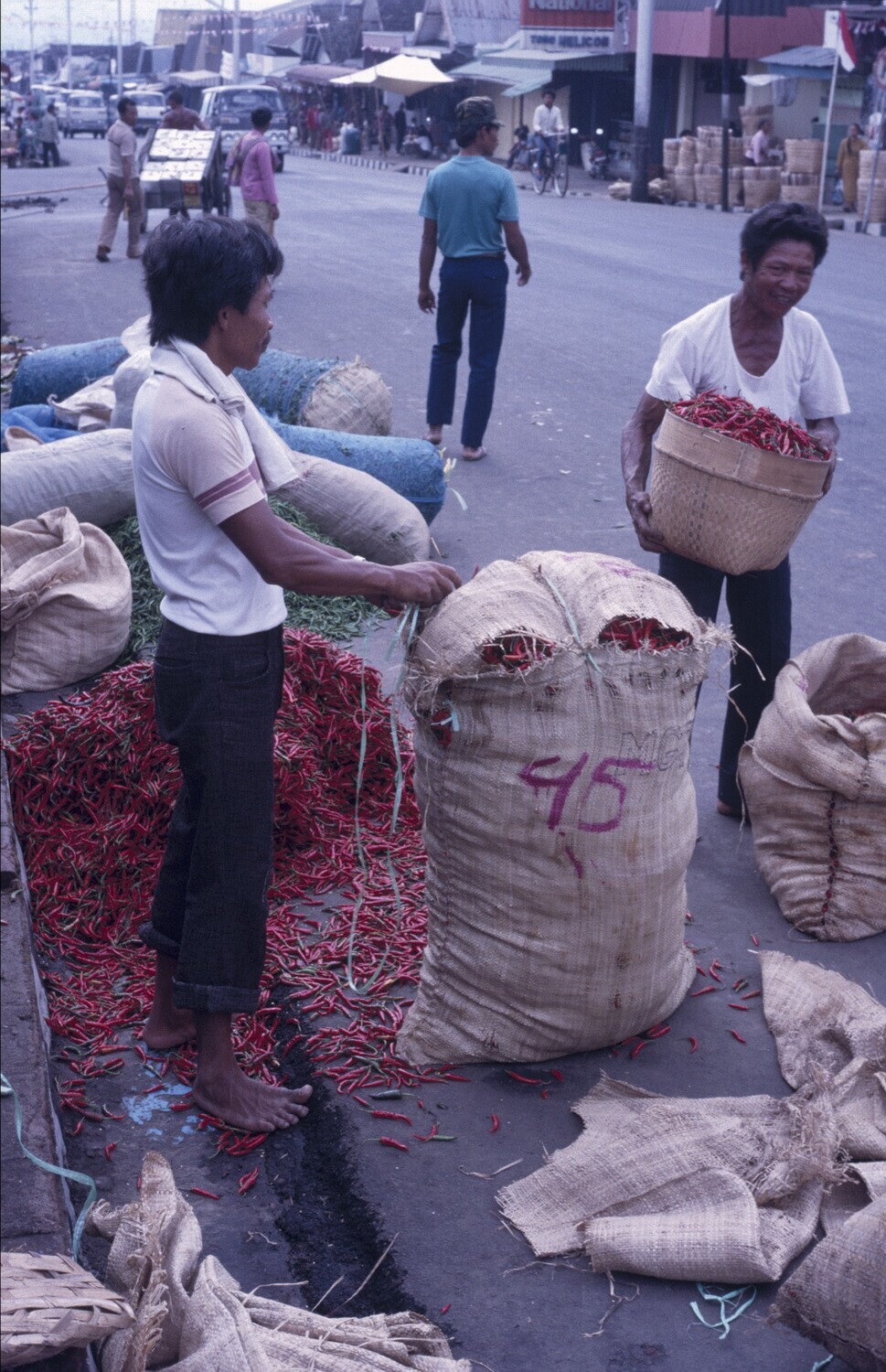 Verkoop van rode pepers.