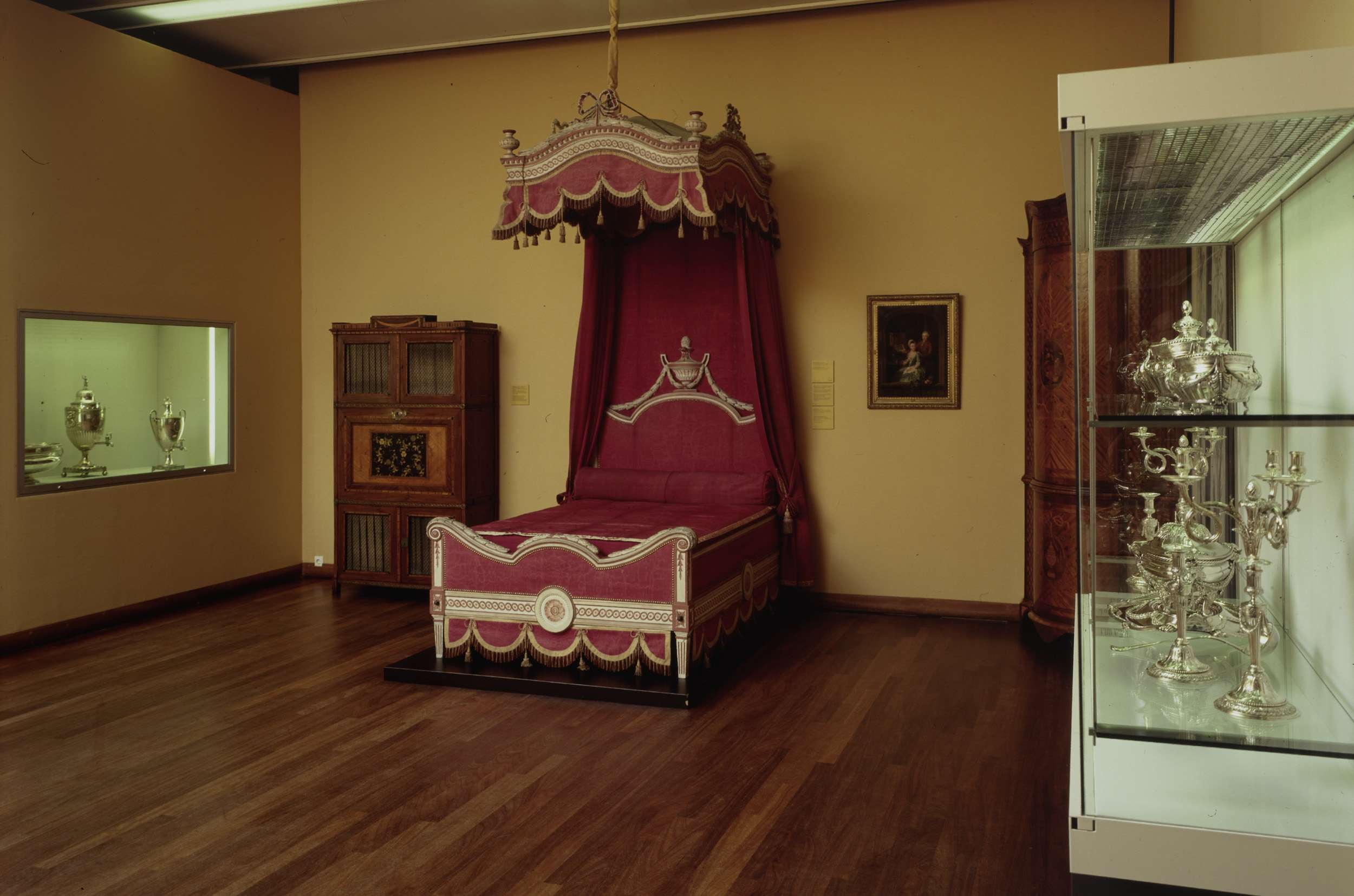 Zaal 29 met een hemelbed, vitrines met zilverwerk, e...