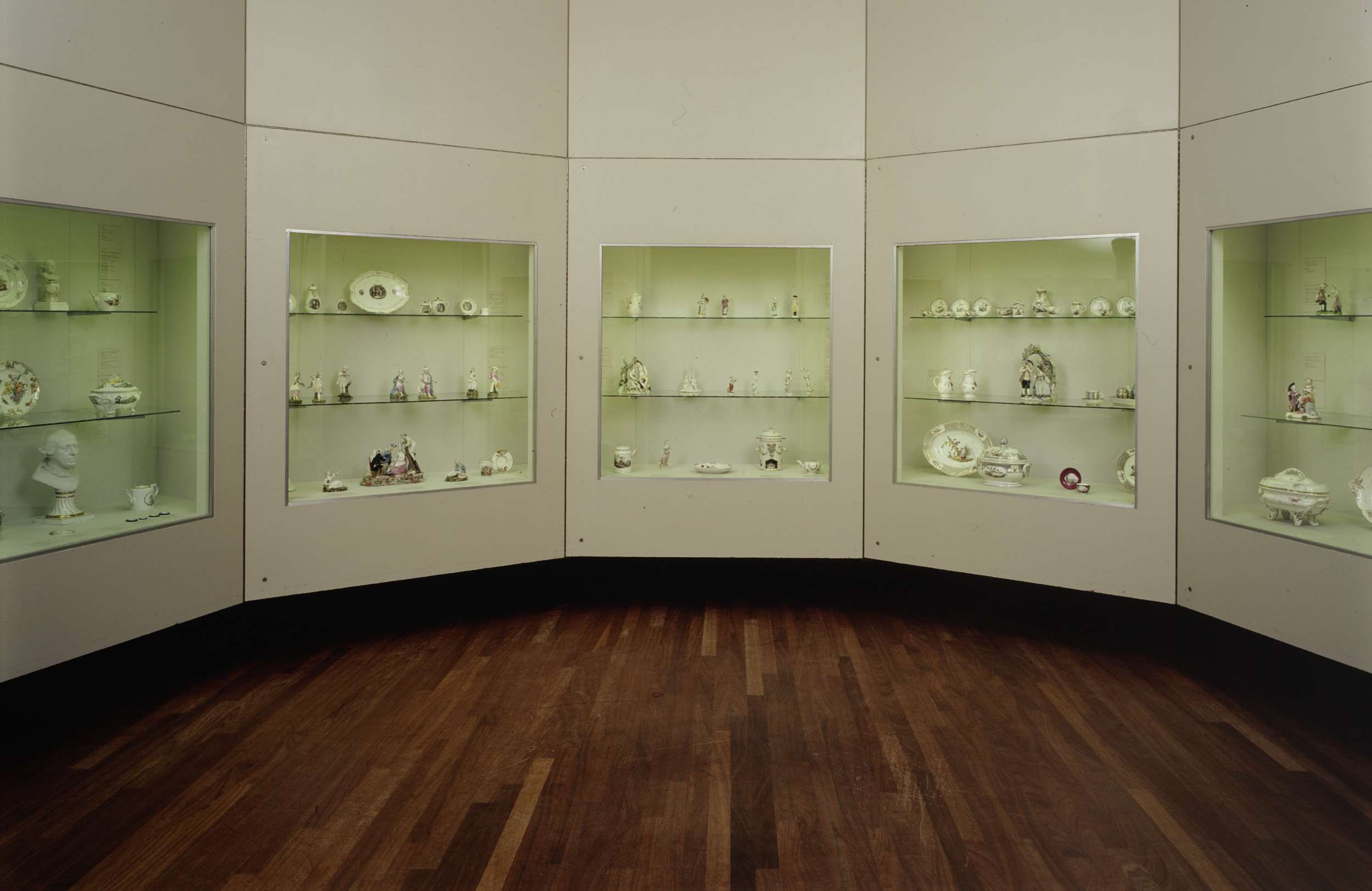 Veelhoekige zaal 28 met vitrines met porselein