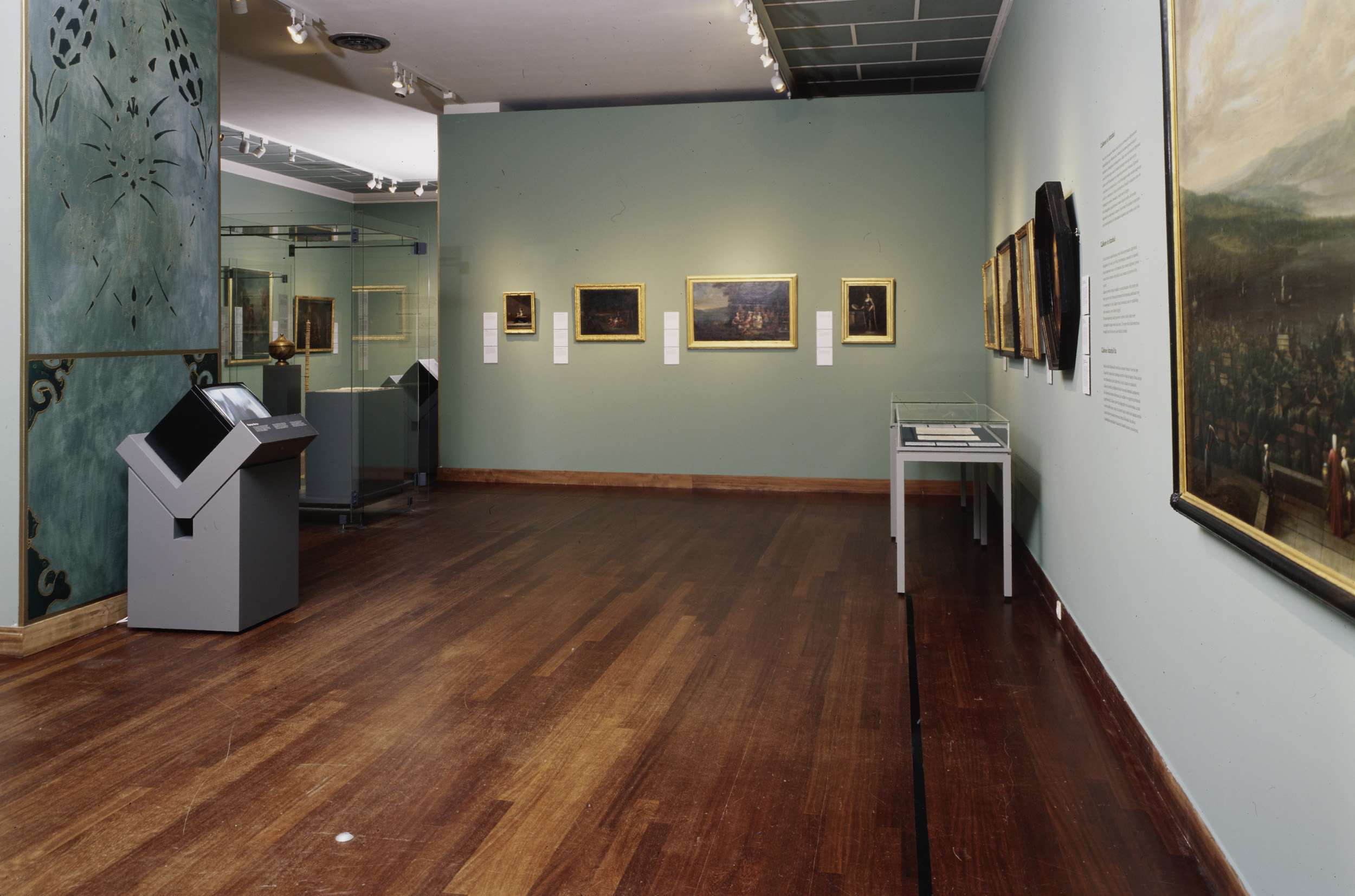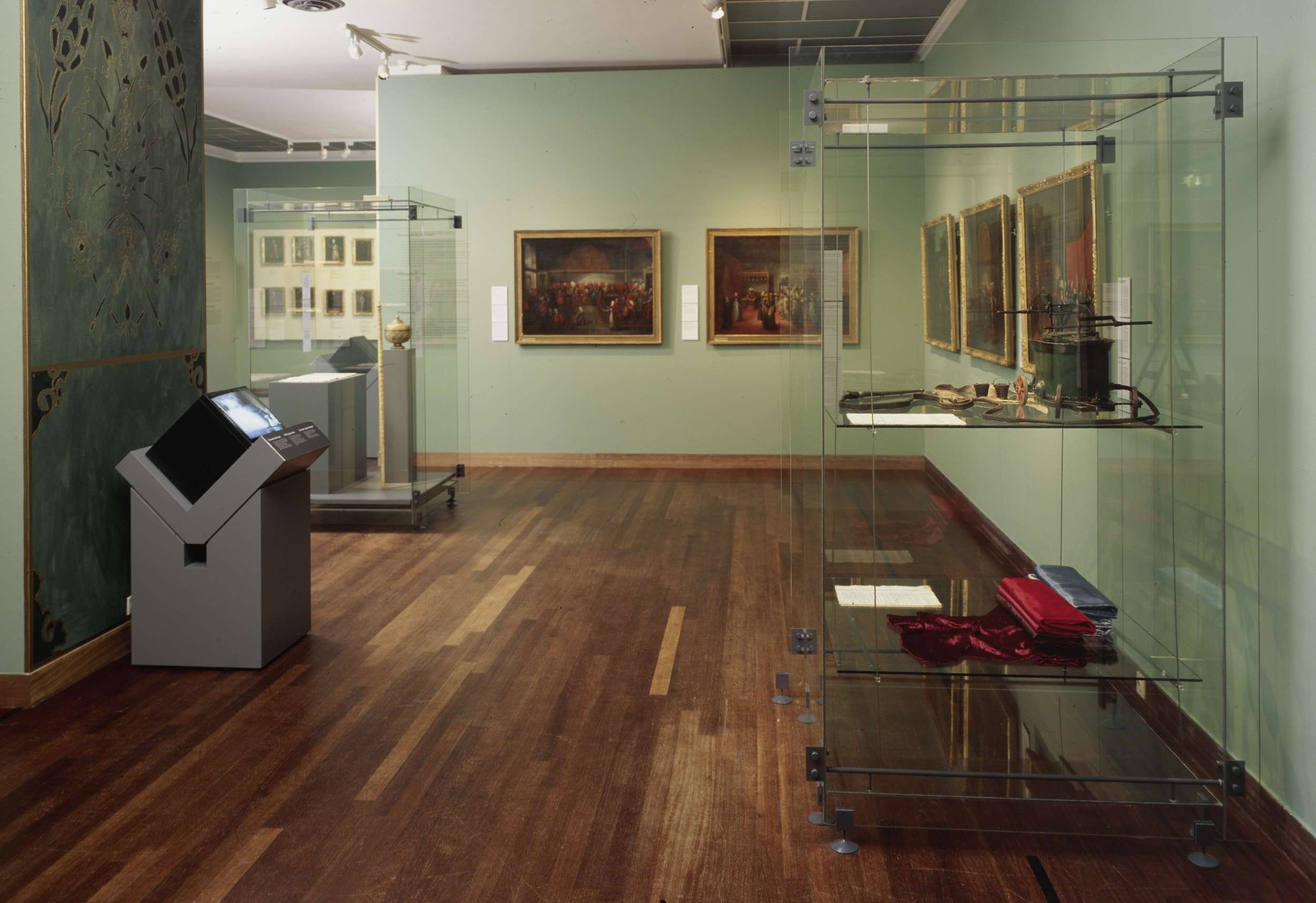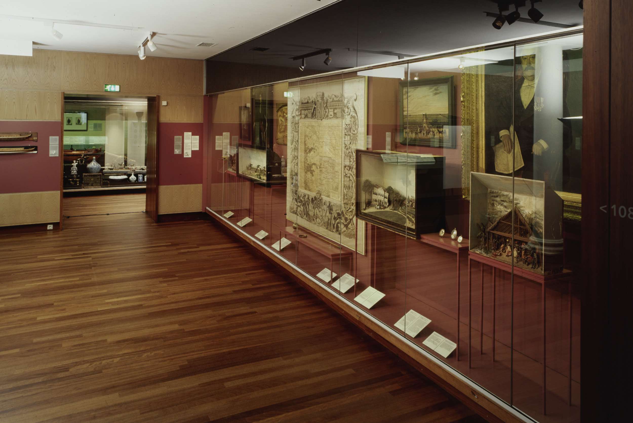 Zaal 108 met onder andere schilderijen en een vitrin...