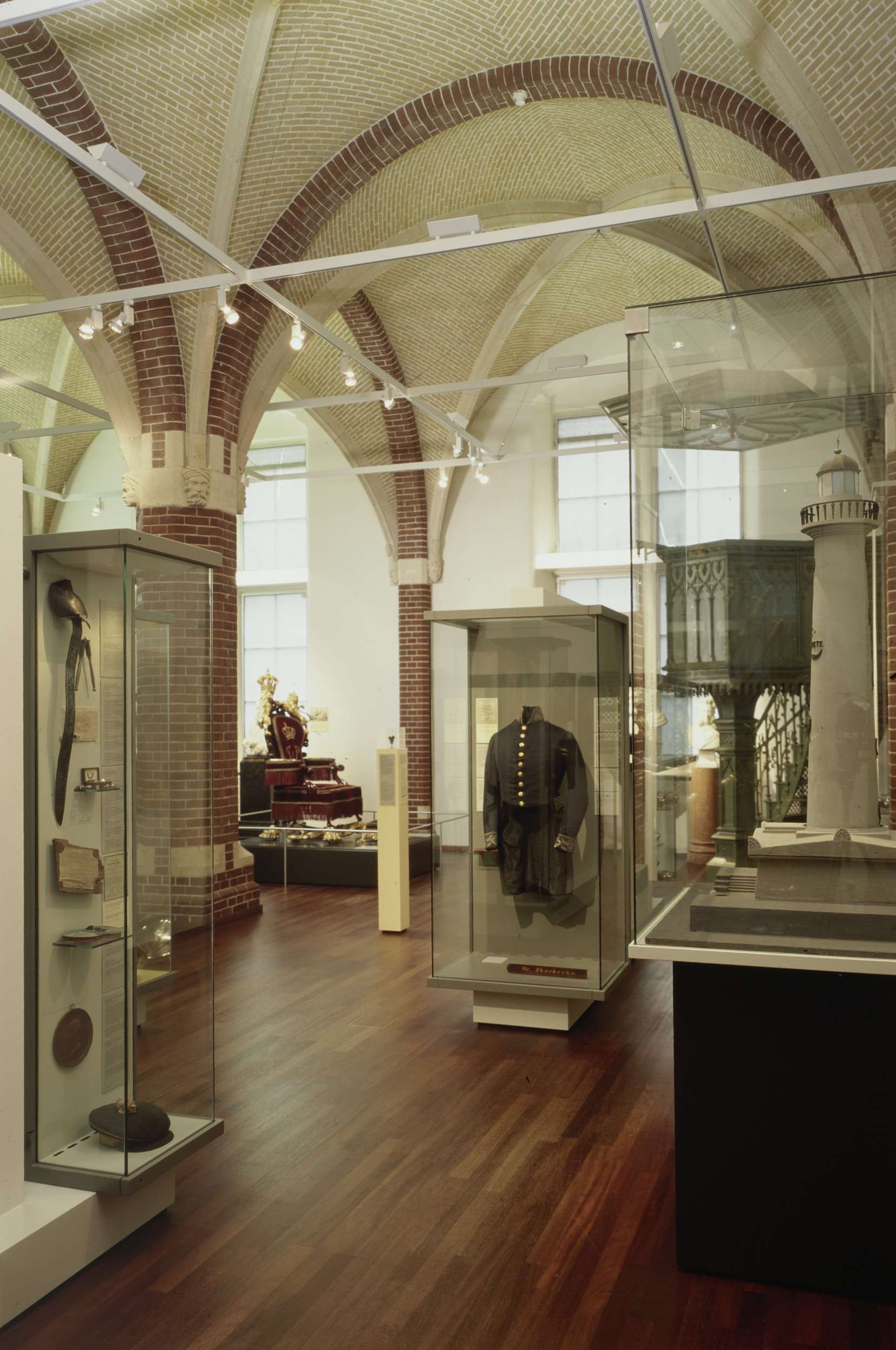 Zaal 112 met kansel en vitrines, waarvan één met een...