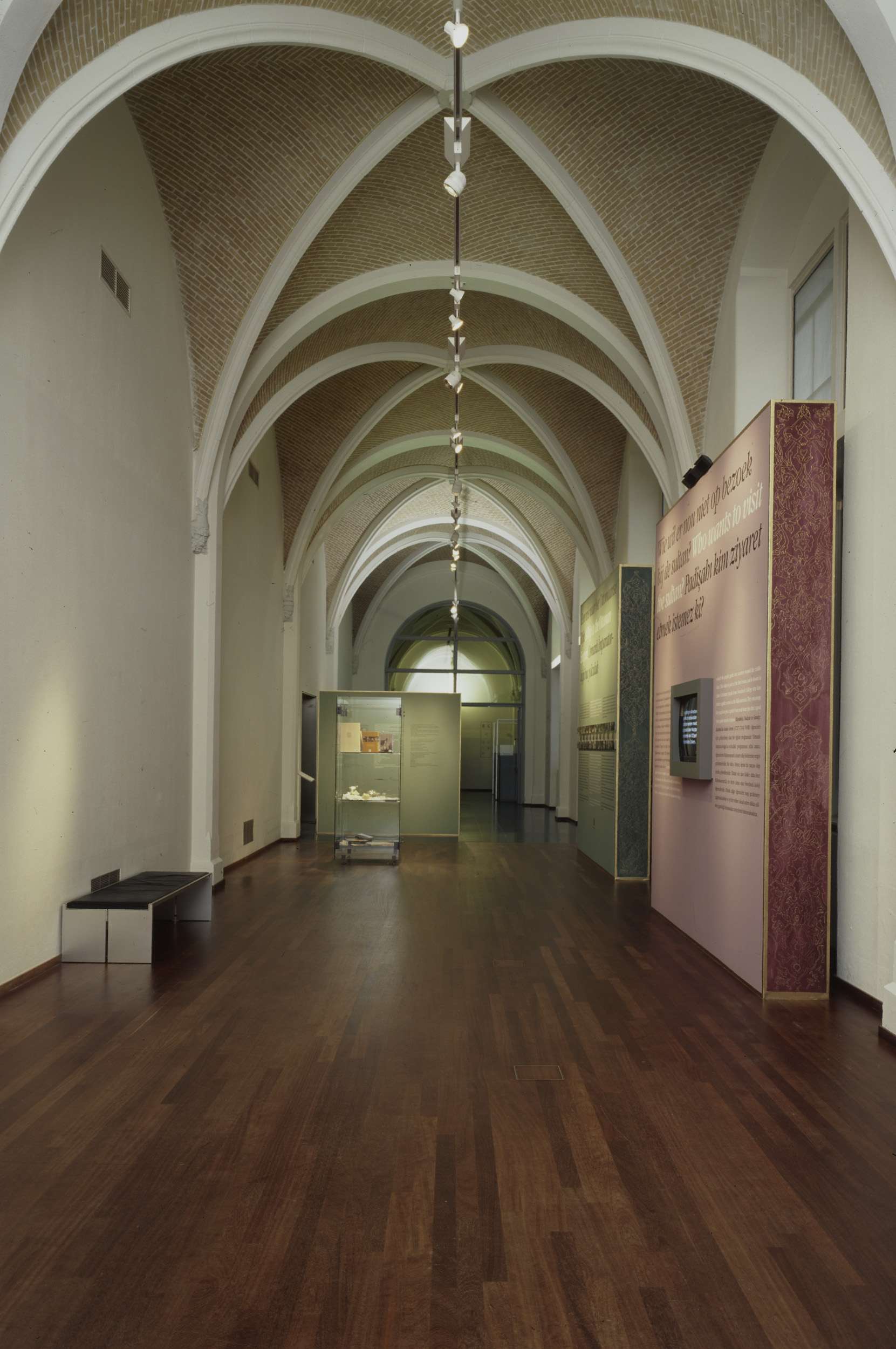 Zaal 114 (gang) met informatiepanelen, een bank en g...