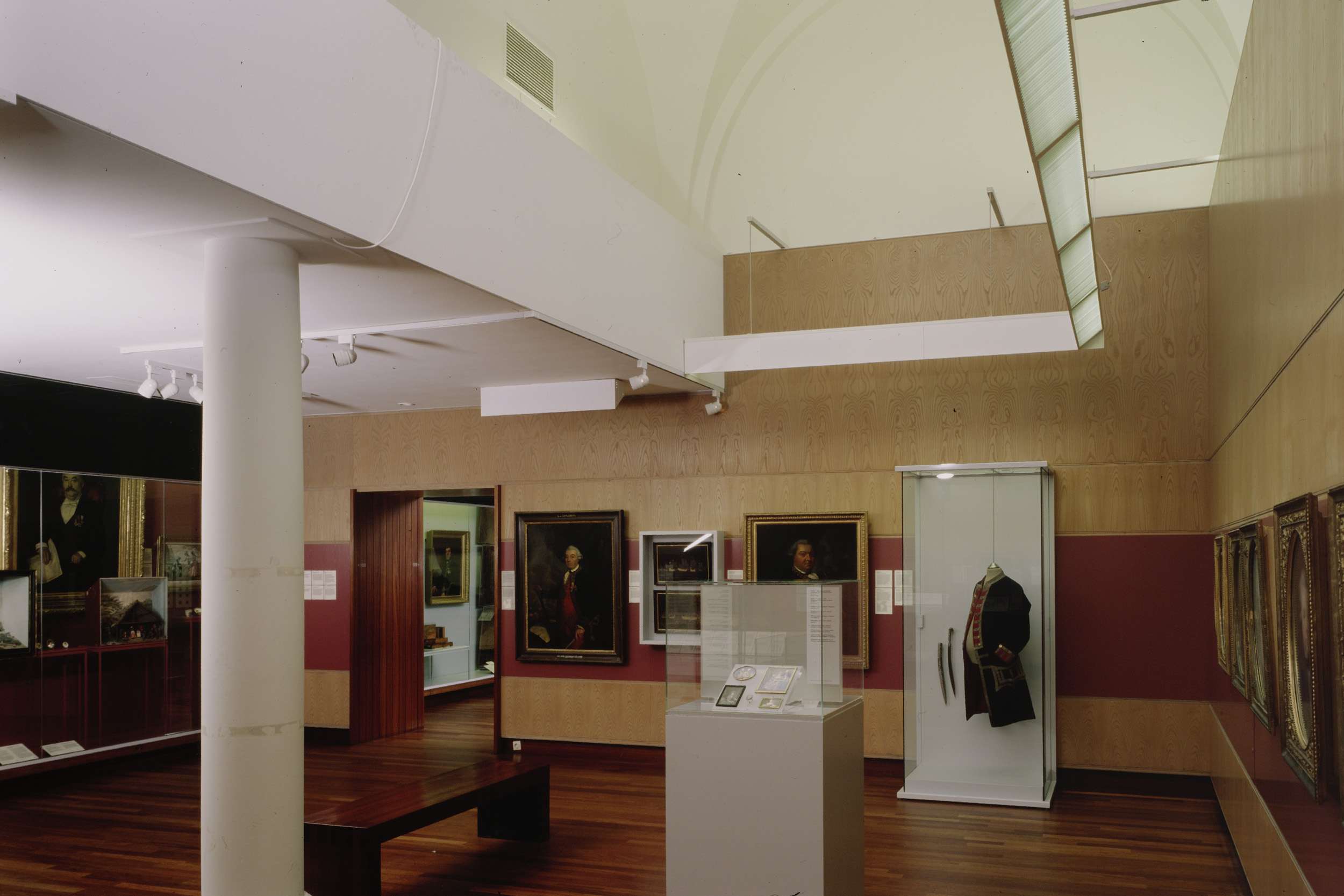 Zaal 112 met vitrines met militaire kostuums, schild...