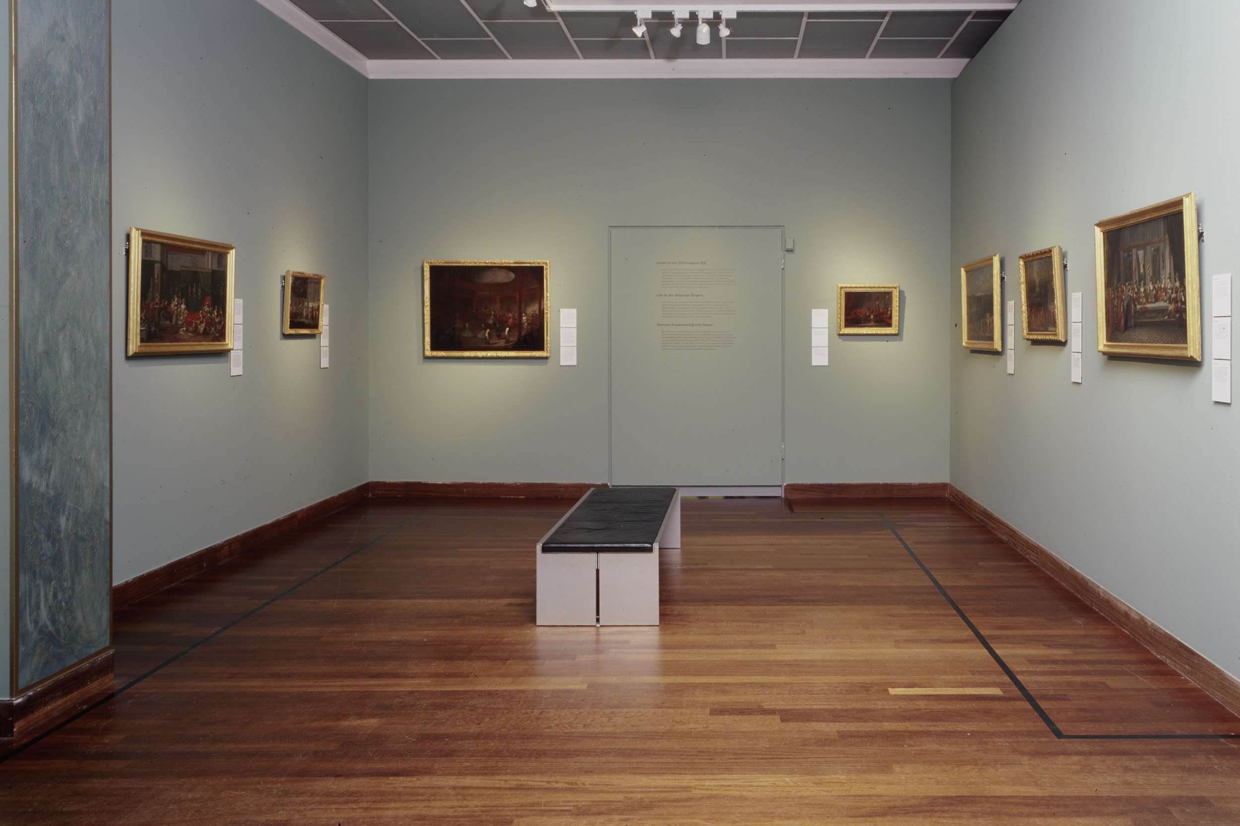 Zaal 101 met schilderijen, vitrines en een bank