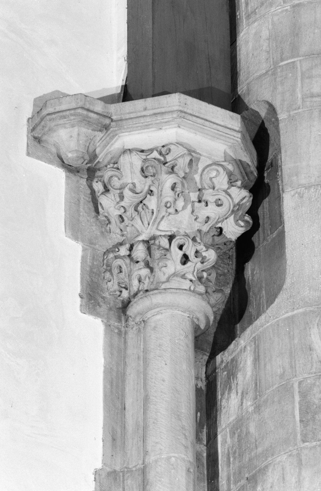 Interieur, kapiteel op een kolonnet in de kooromgang...