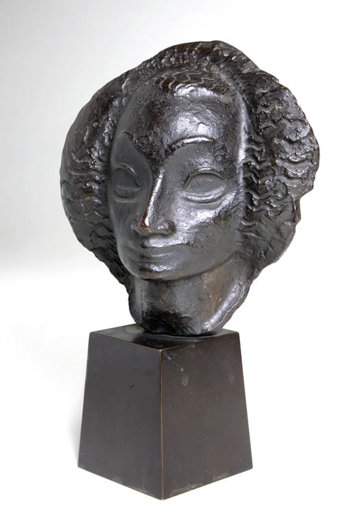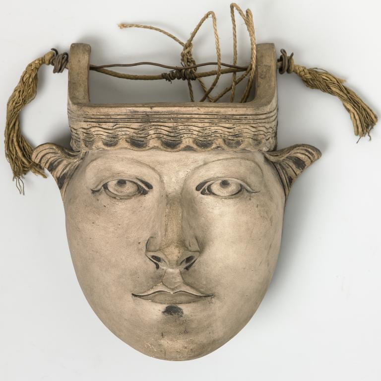 Masker van een vrouwenkop, gemonteerd op paneel