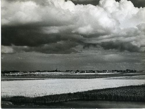 Foto in zwart-wit van weilanden met hoge waterstand ...