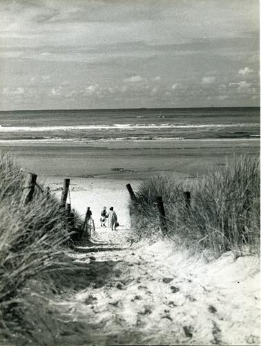 Foto in zwart-wit van mensen bij duinen, strand en z...