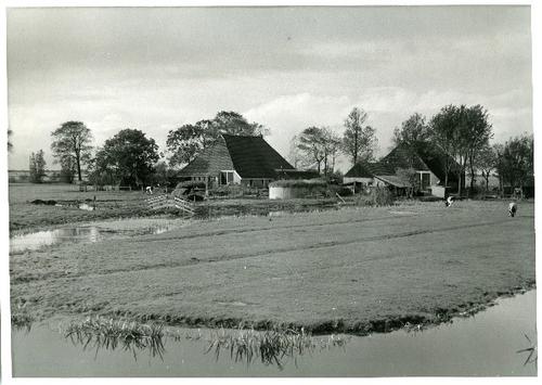 Foto in zwart-wit van een kop-rompboerderij bij Grou...