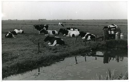 Foto in zwart-wit van herkauwende koeien door J.D. d...