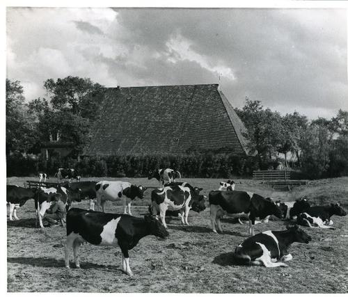 Foto in zwart-wit van een kop-hals-rompboerderij met...