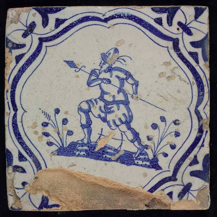 Figuurtegel, drijver of soldaat met hoorn en speer, ...
