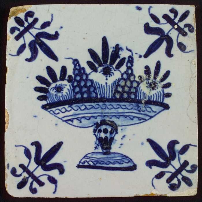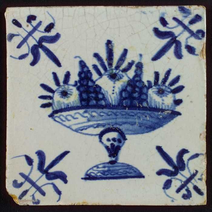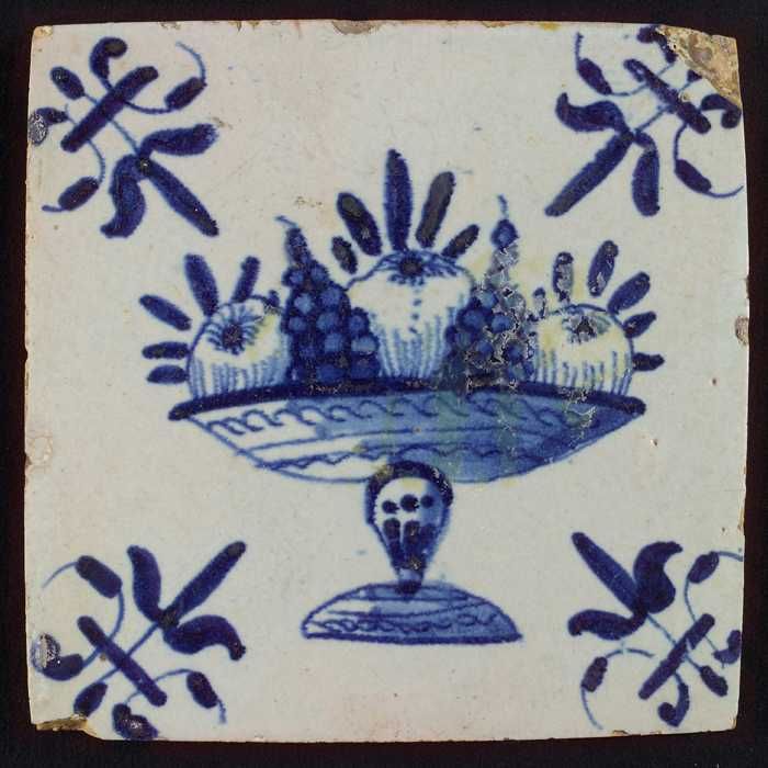 Tegel met blauwe fruitschaal; hoekmotief lelie